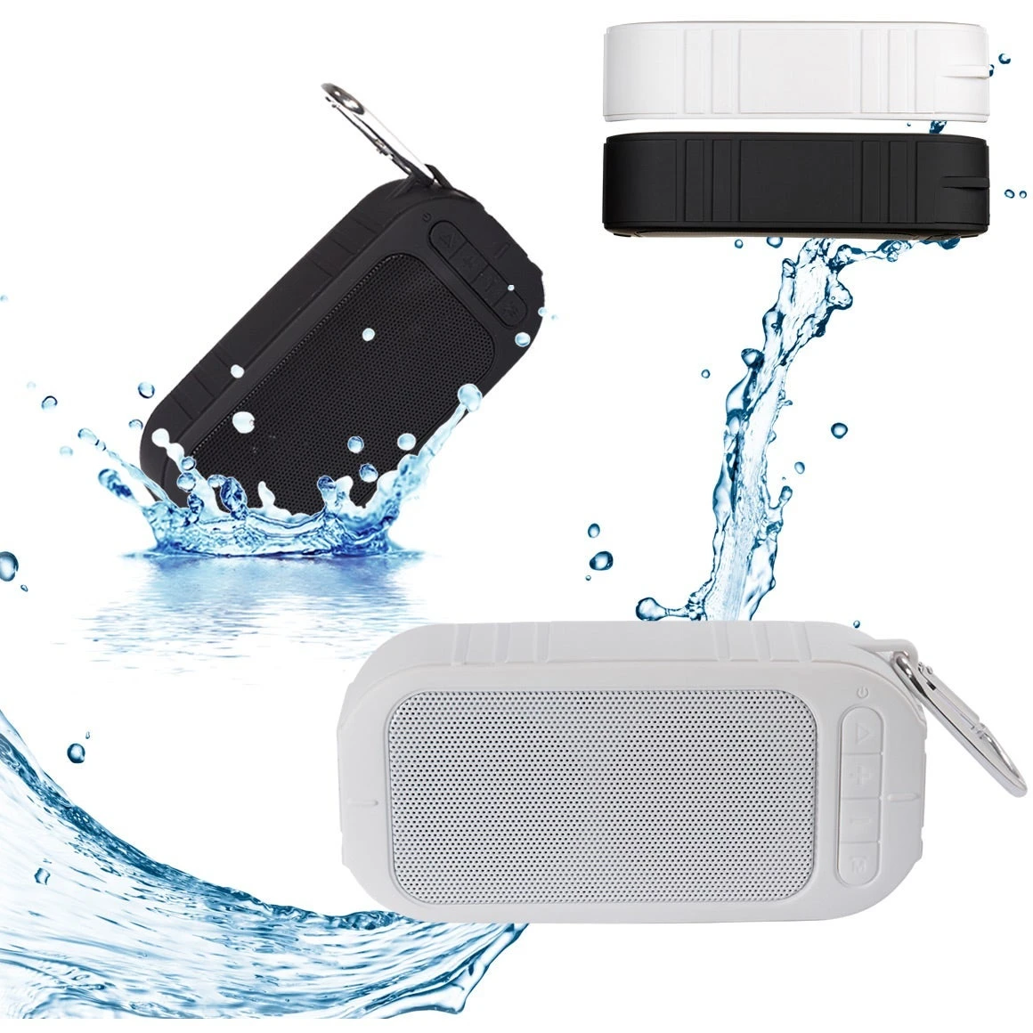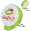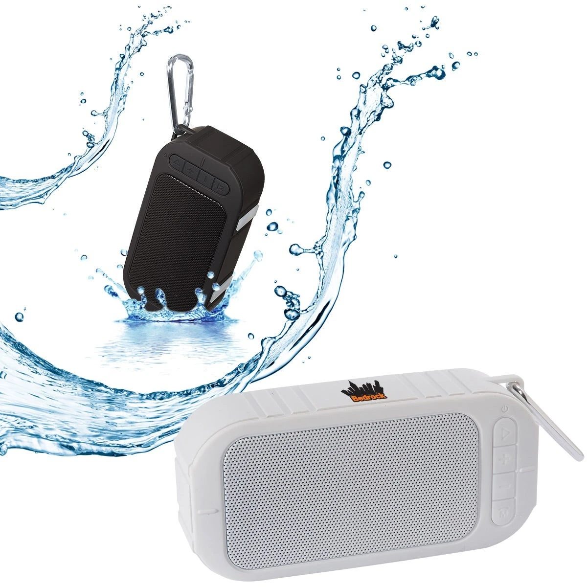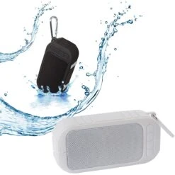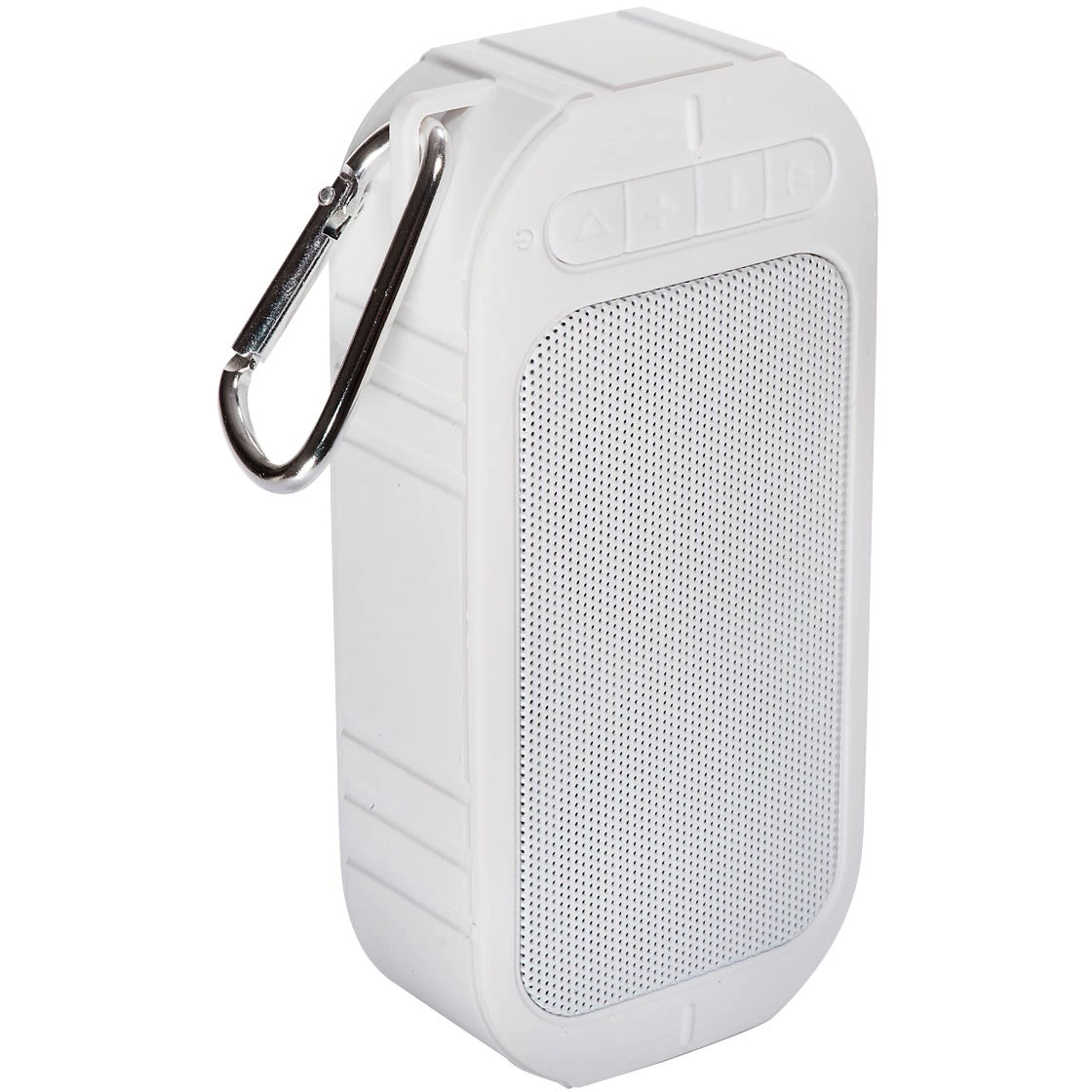 Rechargeable lithium ion battery: 400 mAh/3.7V; input: DC 5V; output: 3W; Bluetooth 2.1; frequency 100hz – 20khz; SNR: 80dB; transmission range: up to 10m (30 ft); water-resistant to IPX5 standard. Splashes of water only. DO NOT SUBMERGE. Functions include: speaker, FM radio. Made of ABS Plastic, with Aluminum carabiner attached. Connects to your mobile device using wireless Bluetooth technology. Can also connect through 3.5mm audio cable (included). Approx. playback time: up to 2-4 hours. Device lights up red while charging. Light turns off once charge is complete. Includes USB to micro-USB charging cable and 3.5mm audio cable. Must charge prior to first use. Charge time varies by device. Instructions included. FCC approved. Recommended imprint colors: metallic gold or silver. White imprint is not recommended.