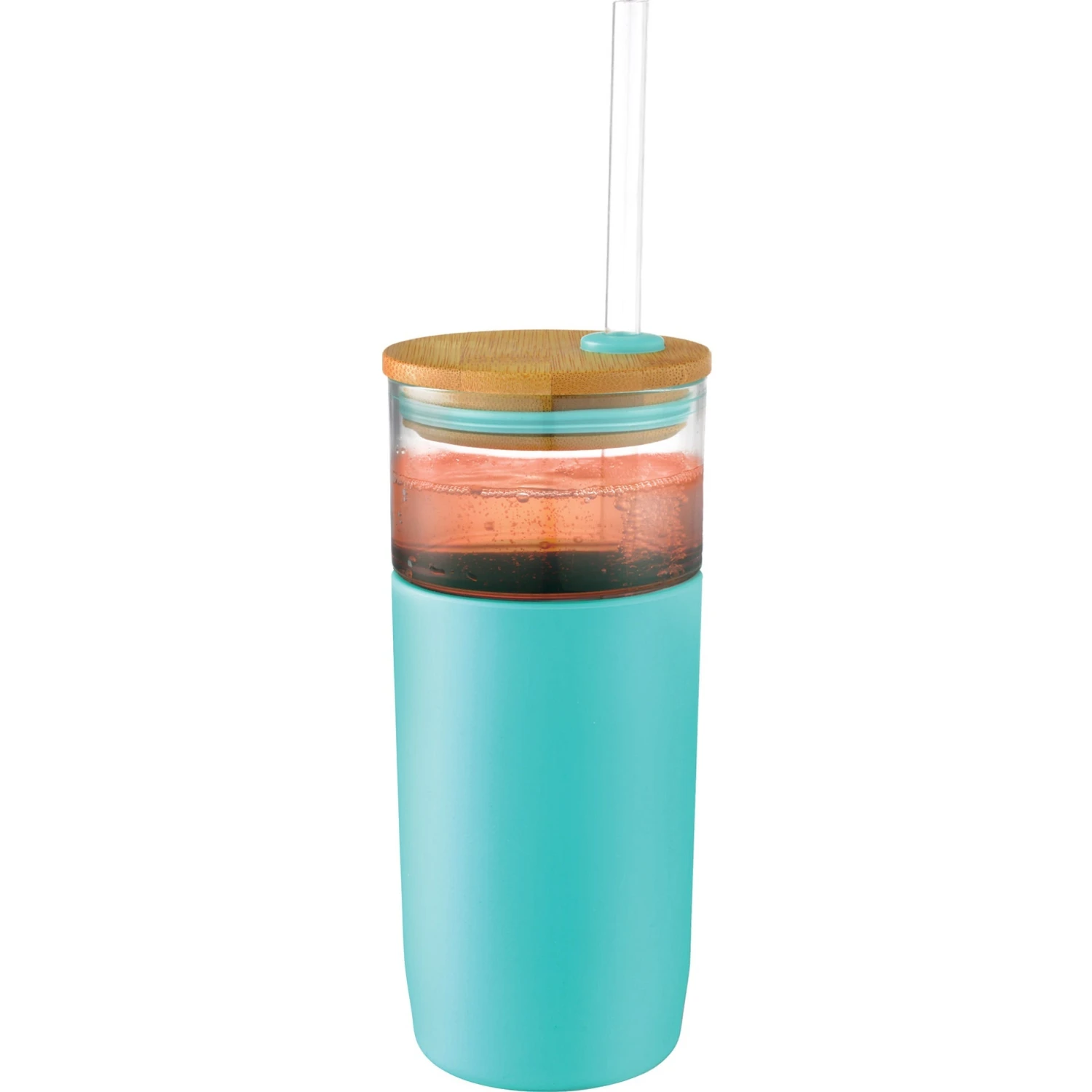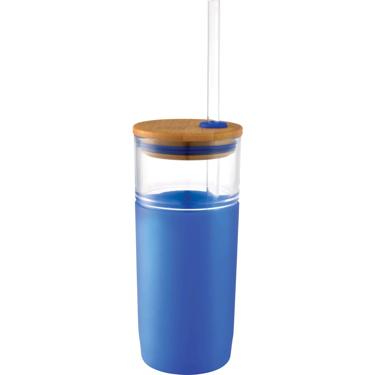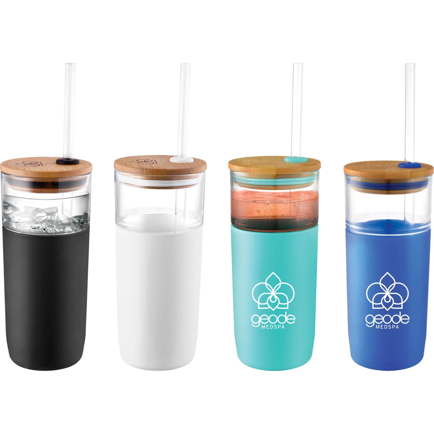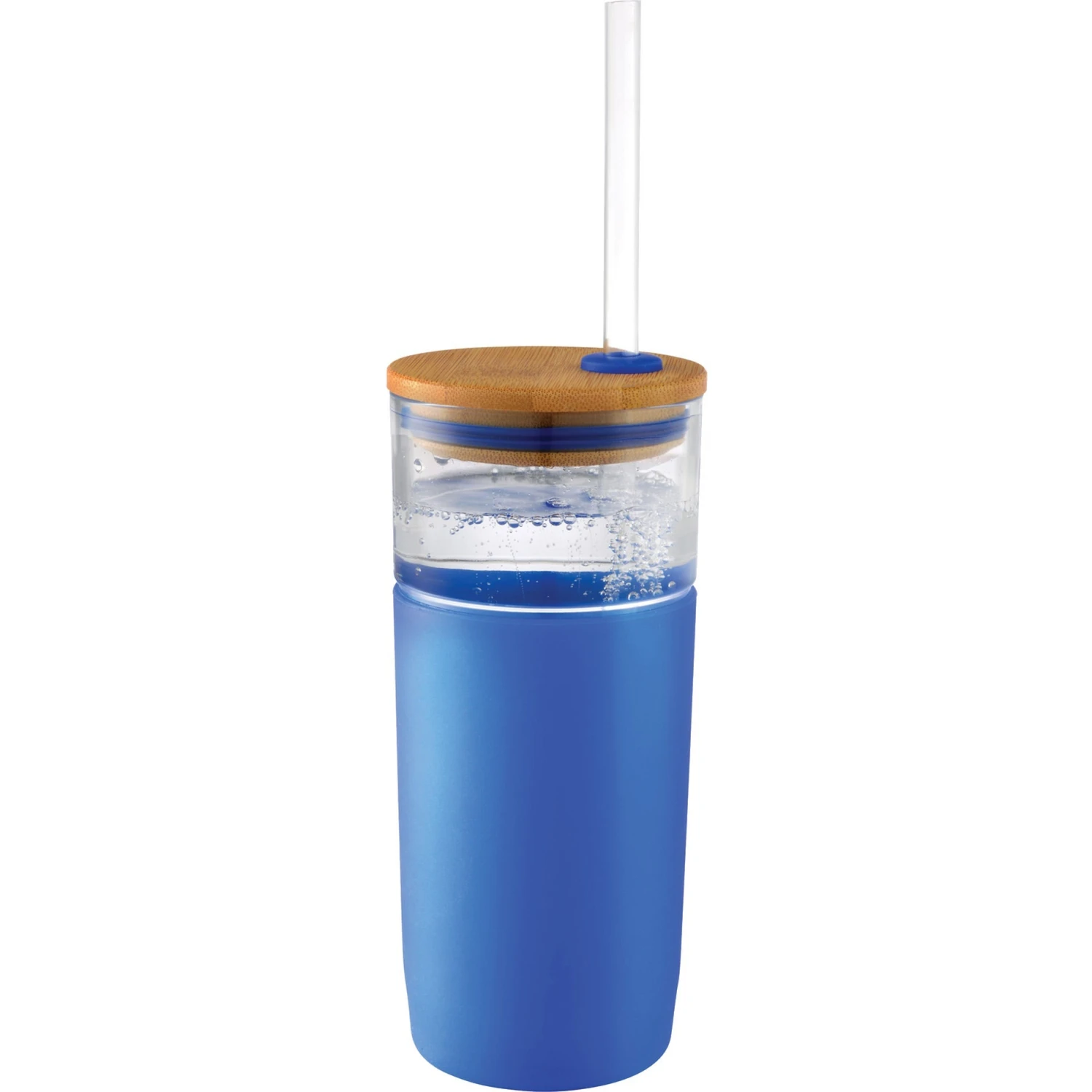 Single-wall glass tumbler. Soft, grip sleeve. Bamboo push-on lid, matching Tritan straw included. Non-slip bottom, fits in most car cup holders. Do not freeze or microwave. Use soap and water to clean, keep the bamboo lid dry when not using. Choose between color imprinting or our new cutting edge, dishwasher safe, laser decoration method. BPA Free. 20 ounces.