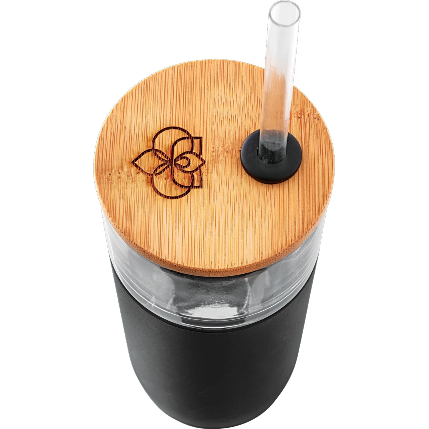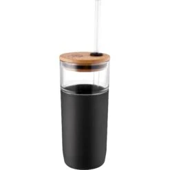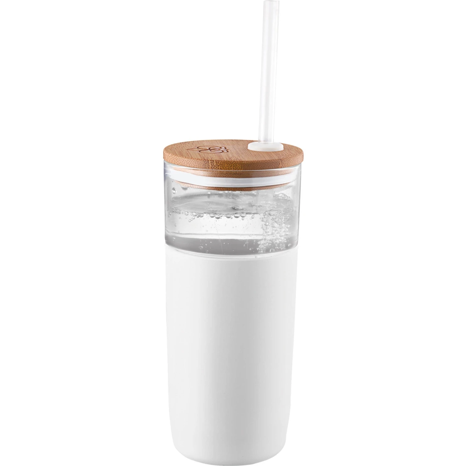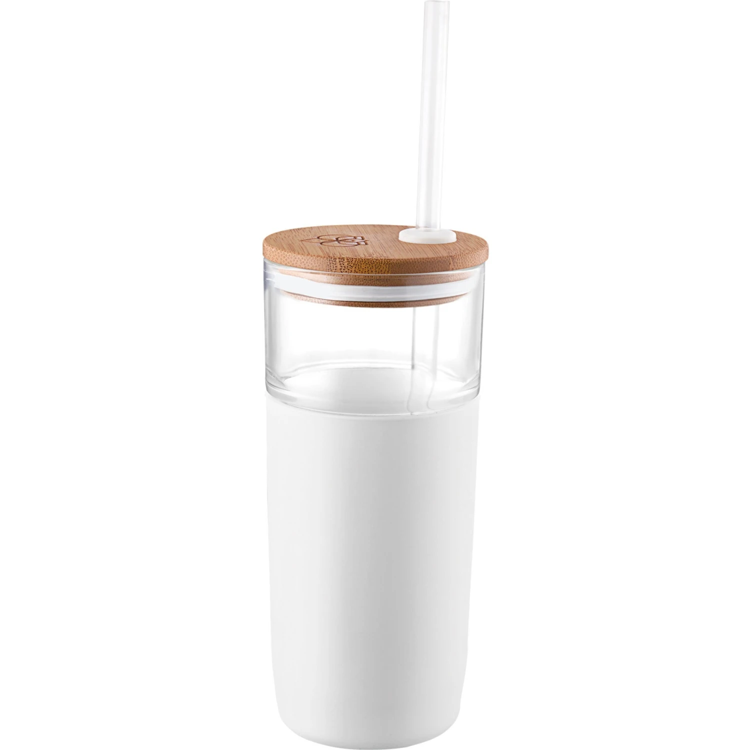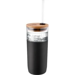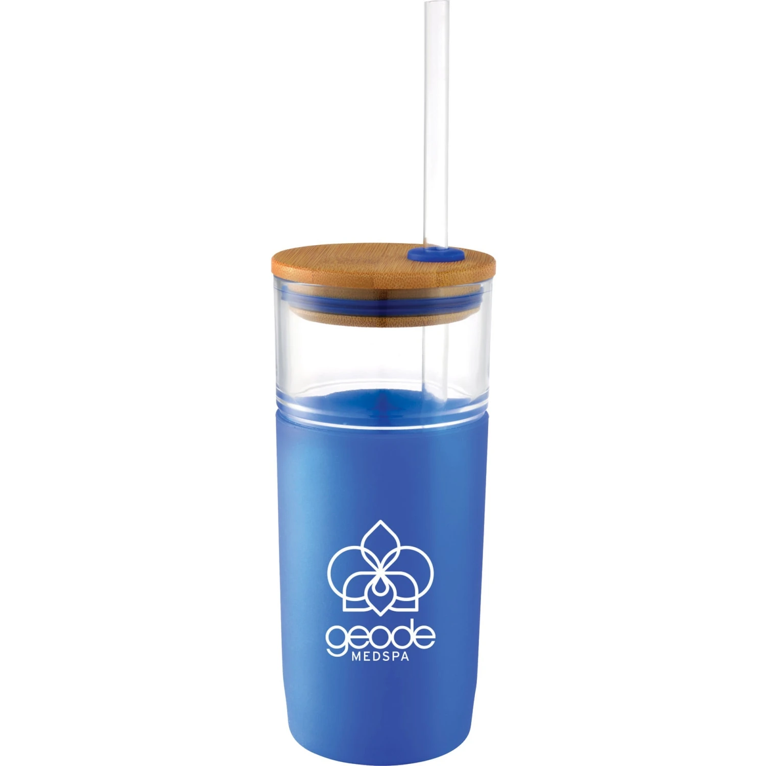 Single-wall glass tumbler. Soft, grip sleeve. Bamboo push-on lid, matching Tritan straw included. Non-slip bottom, fits in most car cup holders. Do not freeze or microwave. Use soap and water to clean, keep the bamboo lid dry when not using. Choose between color imprinting or our new cutting edge, dishwasher safe, laser decoration method. BPA Free. 20 ounces.