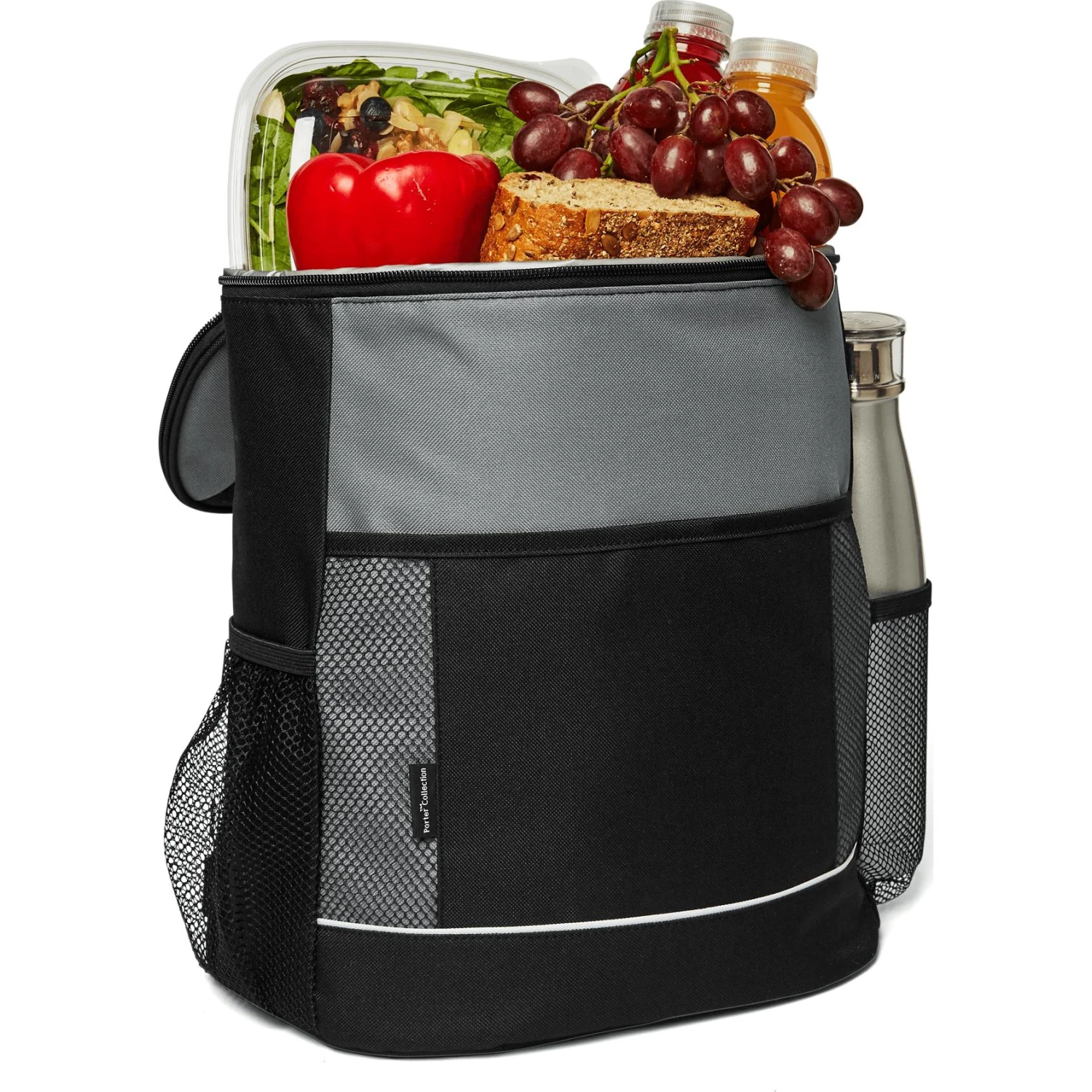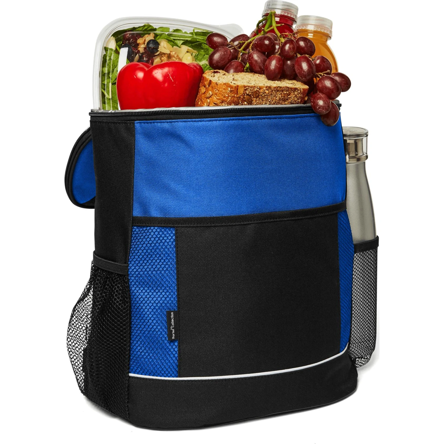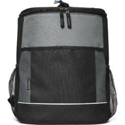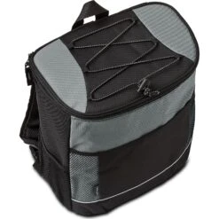600D polyester with 6mm EPE foam with PEVA lining. Large zipper main compartment, front open pocket, 2 side mesh pockets each approximately 5″w x 6.5″h. Padded shoulder straps. Holds 18 cans of your favorite soda. Front open pocket measures approx. 11.25″w x 6.25″h. Elastic bungee on top panel can also be used for storing last minute items. Hand-wash only. Do not iron. Recommended weight tolerance: 22 lbs.