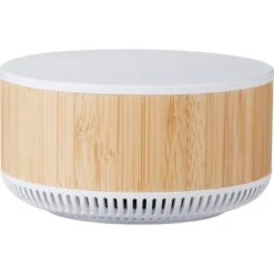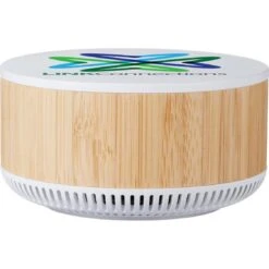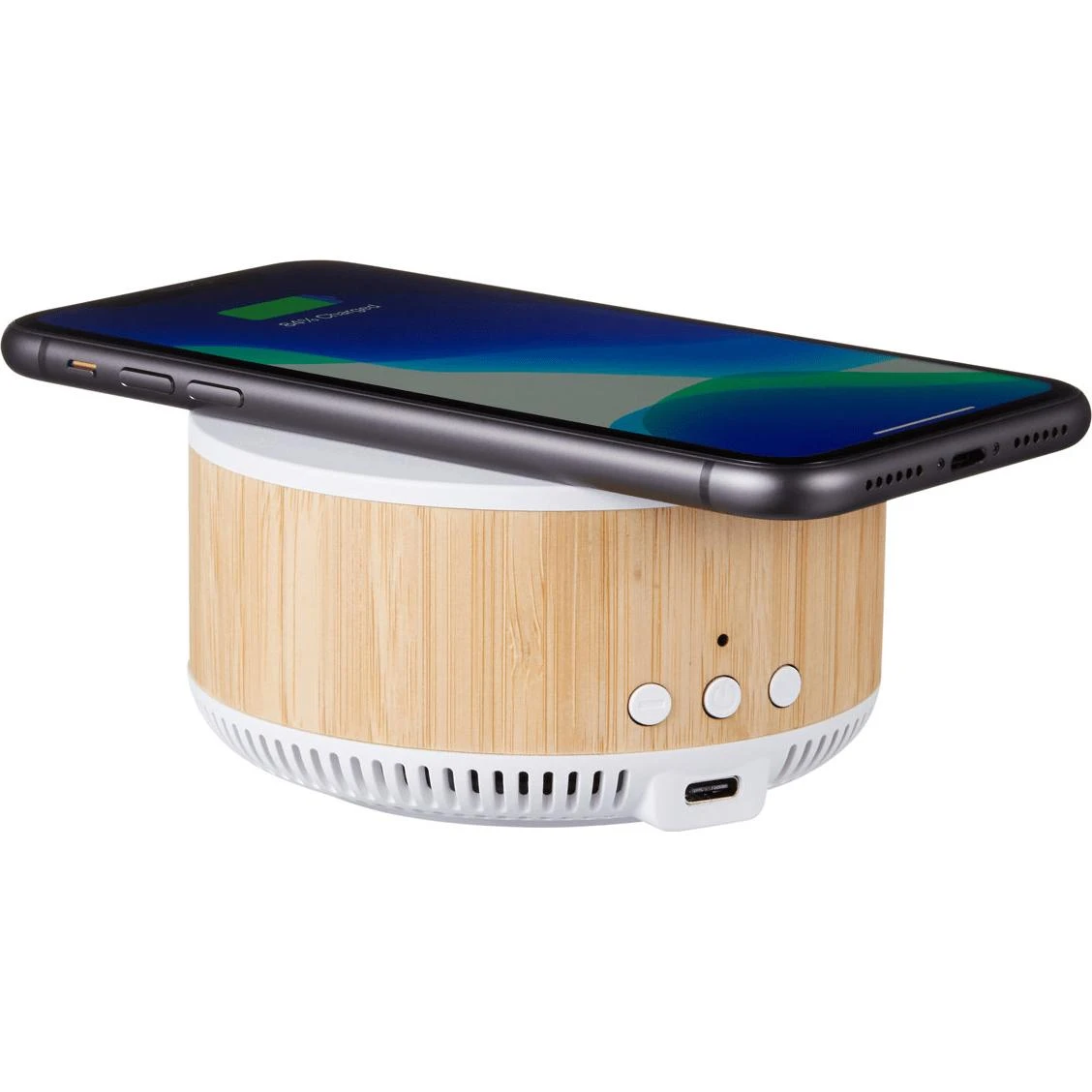 ABS plastic, bamboo. Wireless version 5.1 with rechargeable 720mAh lithium polymer battery. Clear speaker sound with 10W output. Approximate 30-foot wireless range. 15W wireless charger. Base LED lights glow when charging. USB-A charging cable included.