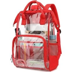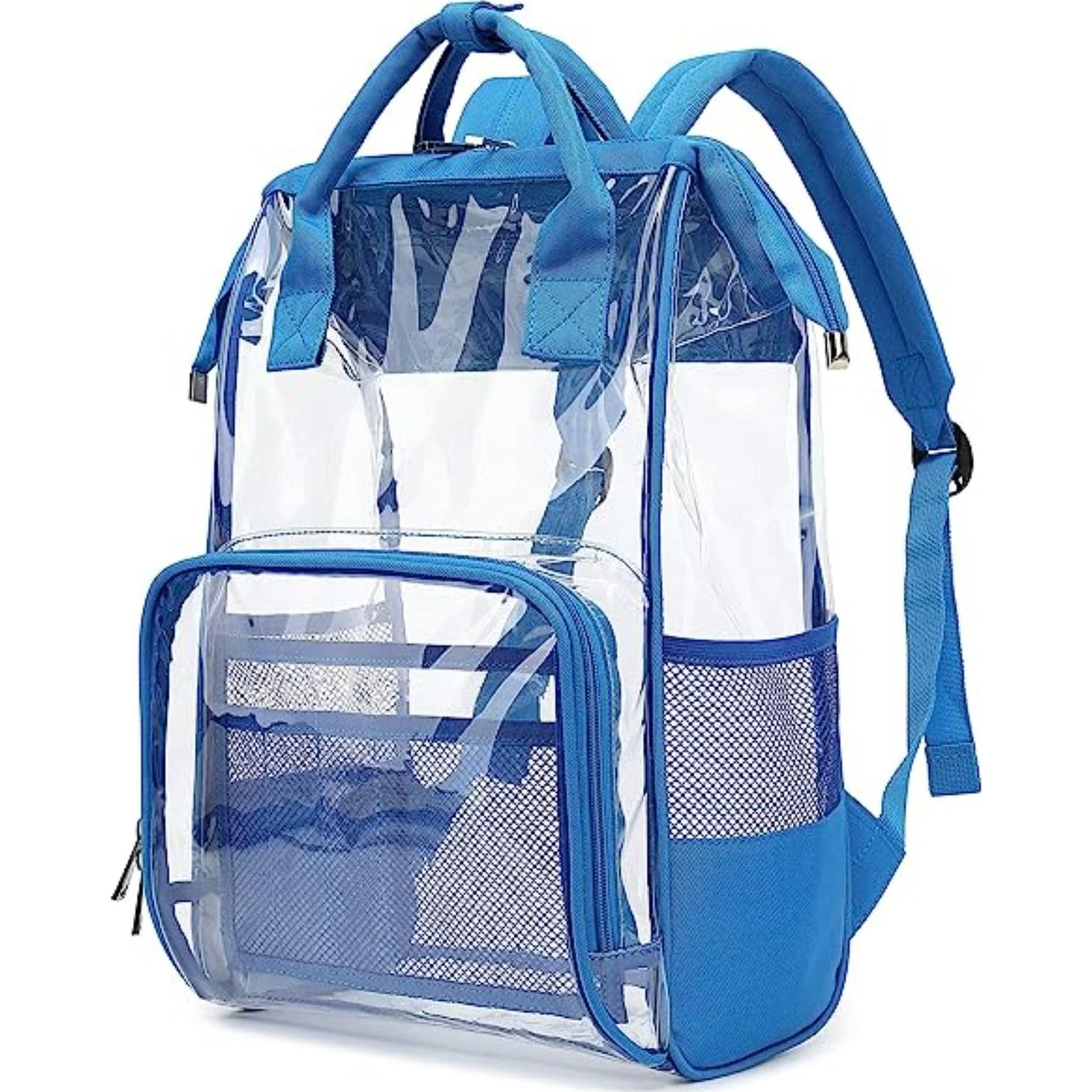 Fully transparent for any security platform. Made of 30C clear PVC. Smooth, flexible, and wrinkle-free. Reinforced, padded, and adjustable straps. One big zipper pocket, one front zipper pocket and 5 mesh slots, 2 tall side pockets.