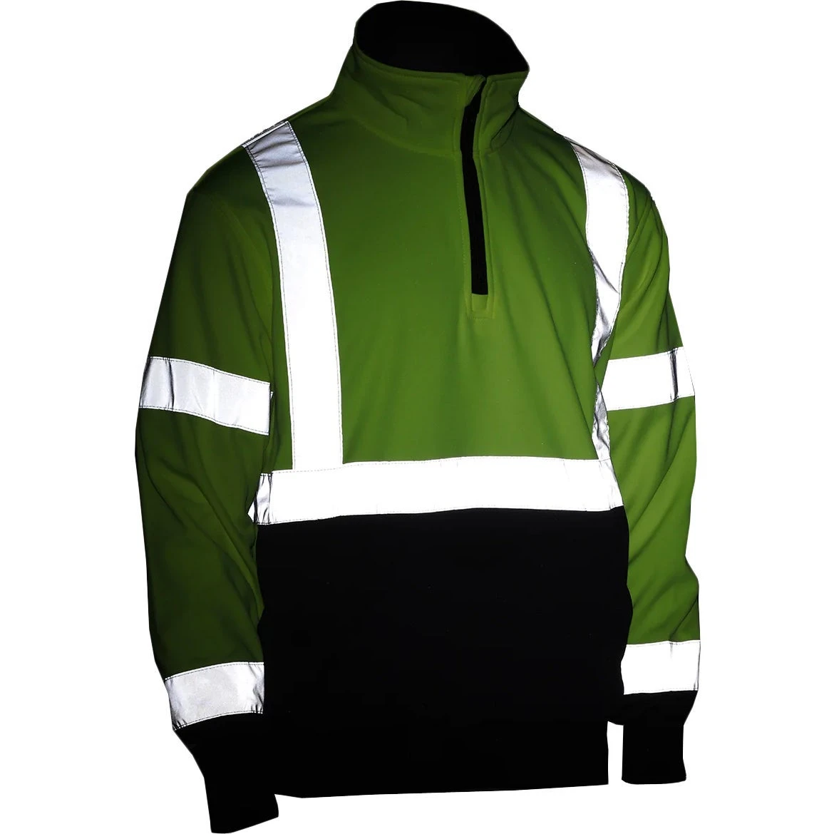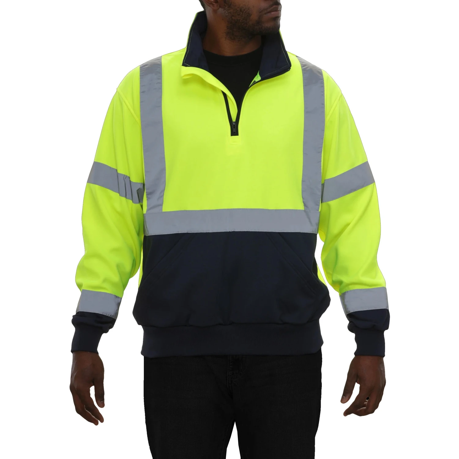 These ANSI III compliant sweatshirts are 100% polyester knitted microfiber fleece that weighs 7 oz. The YKK quarter zip sweatshirt has two large hand warmer pockets for warming hands on chilly mornings. It has a lime and navy color block with a navy funnel collar and rib knit navy cuffs and bottom. 2″ retroreflective tape with 360-degree reflective coverage. Quarter zip closure. 2 large hand warmer pockets. Knitted waist and cuffs. Silver fabric trim is certified to meet ANSI/ISEA 107-2020 Level 2 retroreflective performance. California Prop 65 compliant.
