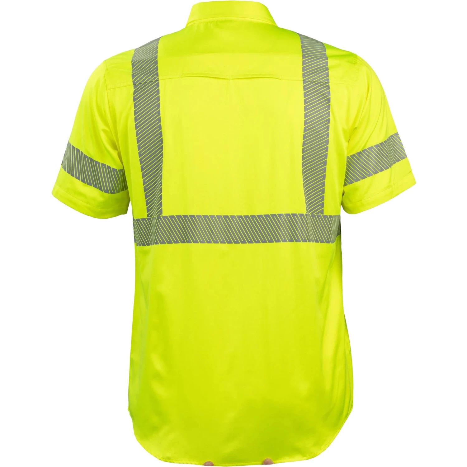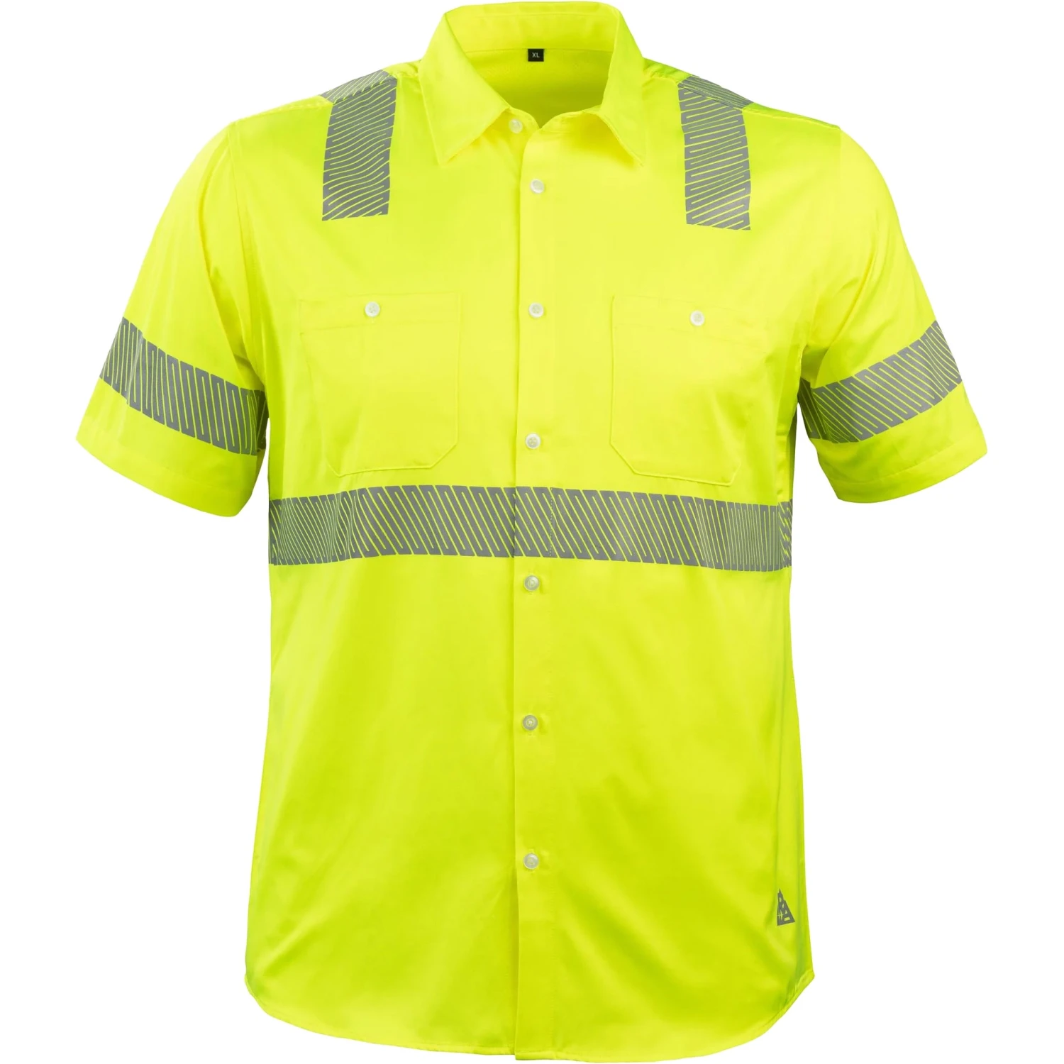 The ANSI Class II high visibility rental friendly safety shirt is a woven satin fabric shirt with 3M Scotchgard moisture wicking polyester for cooling and comfort soil release and wicking finish. The vented back yoke and underarms for breathability. Silverplus technology inhibits bacteria and odor. This shirt has segmented reflective tape for high visibility, comfort, longevity, and durability.