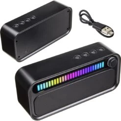 5W wireless speaker with 7 light modes changing rainbow LED lights for perfect party vibe. Sleek mini nostalgic speaker cabinet shape offering prominent top decoration. Music control buttons include play, pause, skip, volume control, answer call, or hang-up. Playing time: up to 6 hours at max volume. Charging time: 2 hours. Connection range up to 33 feet. Includes charging cable. FCC certified.