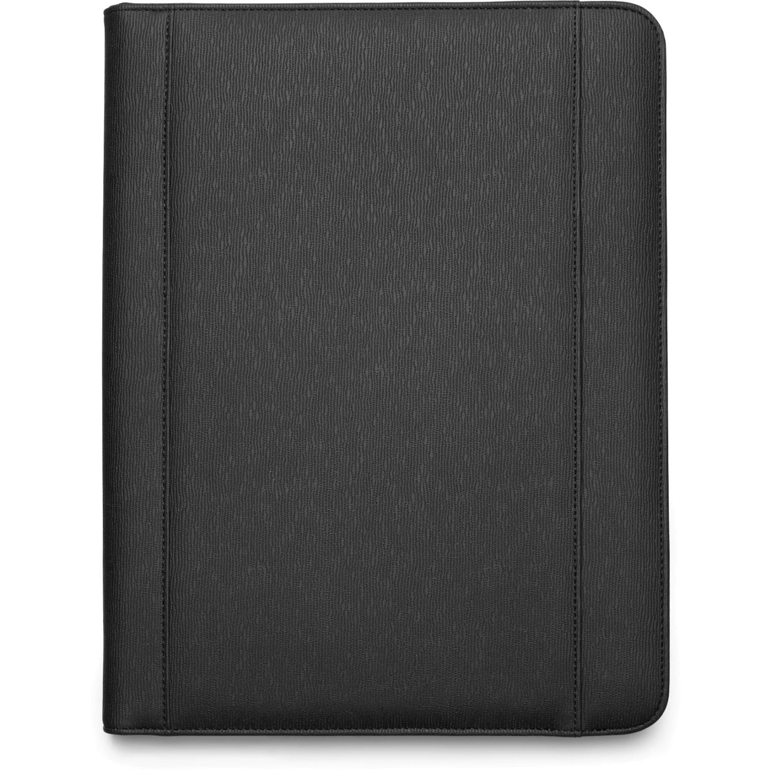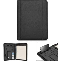 Tech padfolio with built-in power bank and wireless charger and textured PU cover. Features front side pocket and 3 sided zipper closure. Features a rechargeable 3.7V/5000 mAh lithium-ion battery. USB input: DC 5V/2100mA. Wireless output: 5V/1000mA 5W. USB output: 5V/2100mA.