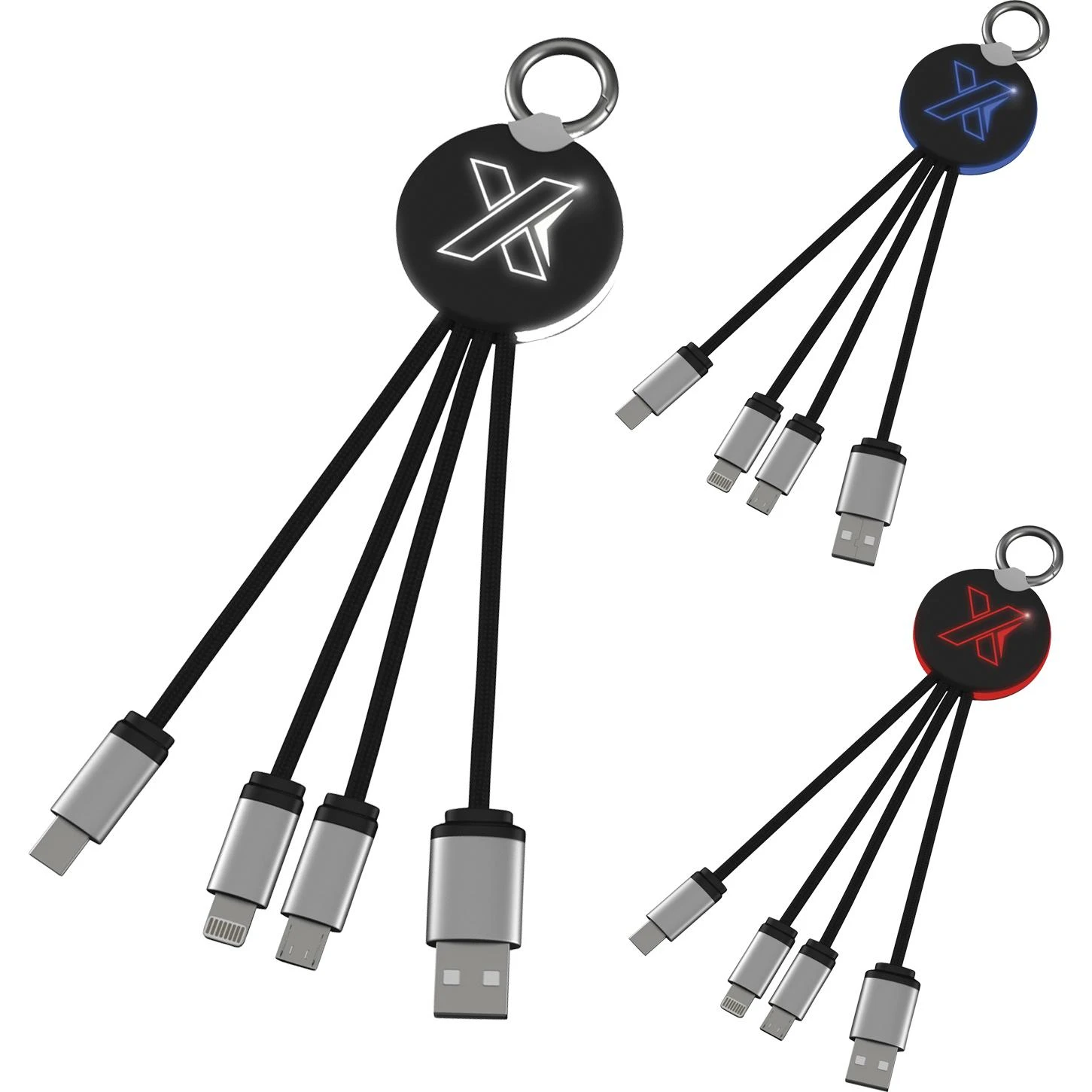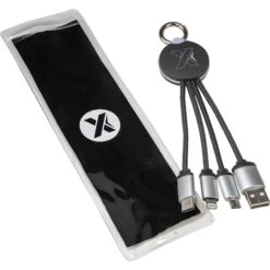 The illuminated logo on this smooth UV-coated and metal cable makes the everyday task of charging your devices a little more fun. As a bonus, the cords are made from RPET, making it an eco-conscious choice. Compatible with Apple 5-Pin, Micro-USB, and USB Type-C devices. Everything comes in a pouch. Maximum output is 3A. Comes with metal key ring. The recycled content is equivalent to 1 plastic water bottle (based on a 16-ounce water bottle).
