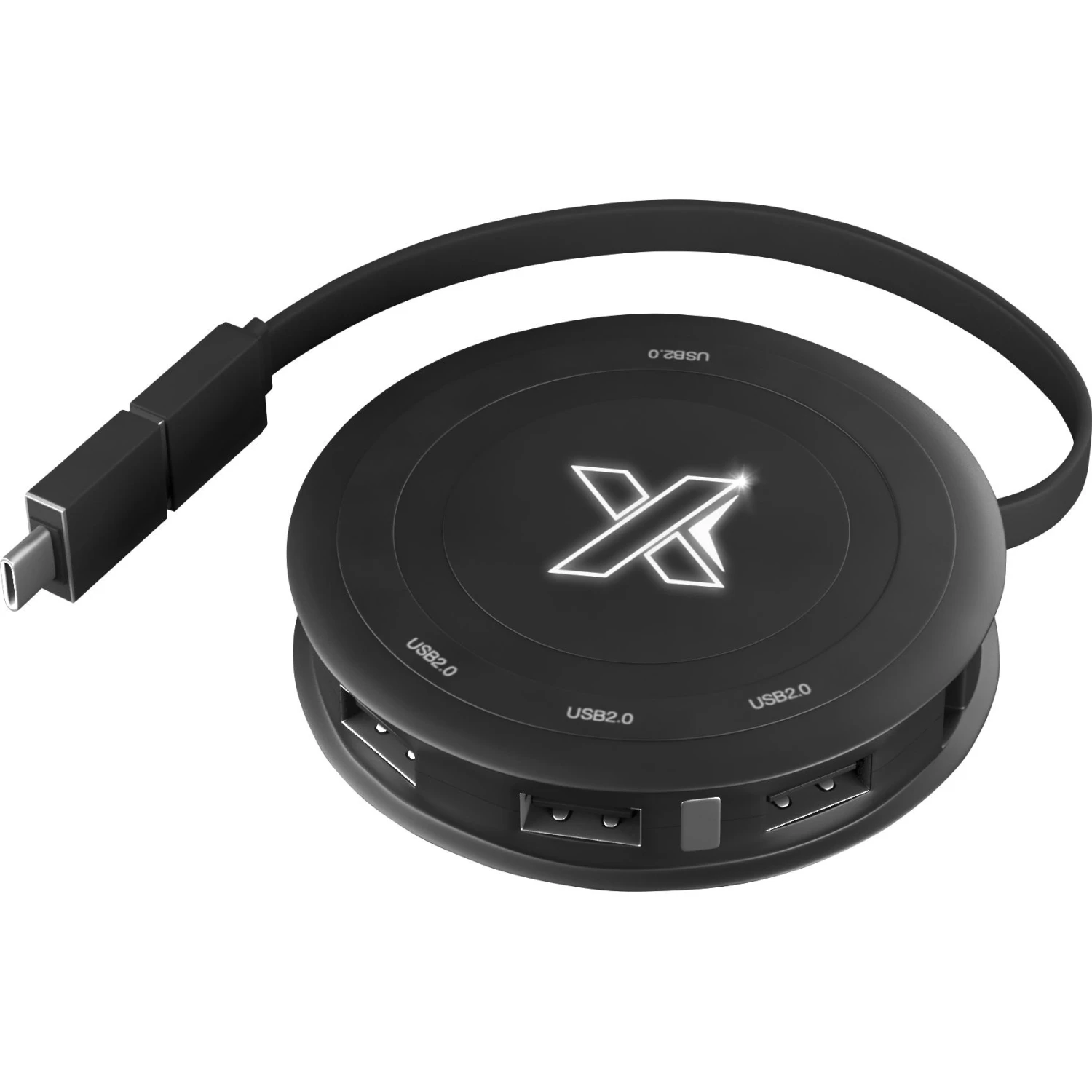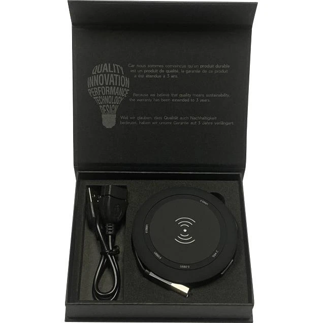 This 2-in-1 wireless charger and USB hub features a practical rubber finish with a fun light-up logo. Use it in the office or on the road to charge your Qi-compatible devices while also connecting up to 4 devices at the same time. Includes USB 2.0 ports, a Type-C 3.0 adapter, a premium gift box, and 3-year warranty. Patent pending.