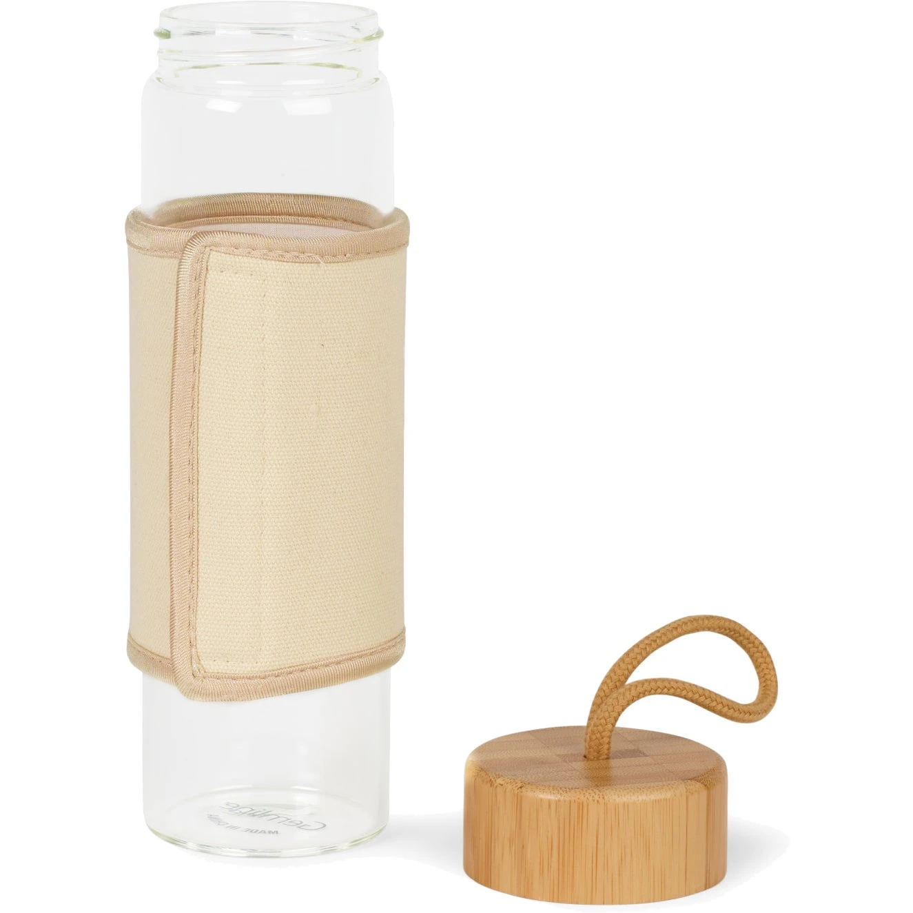 Mixed glass and bamboo materials make for a stylish 18.5 oz. drink bottle. Glass bottle provides a purer drinking experience. Extra-thick borosilicate glass is clean tasting and odor-free. Screw top lid with built-in, braided carry loop for on-the-go use. Wide-mouth opening is ideal for adding ice cubes to your drink. Canvas sleeve protects your bottle and acts as a grip when drinking. Body is dishwasher safe (top rack), hand wash lid and canvas wrap.