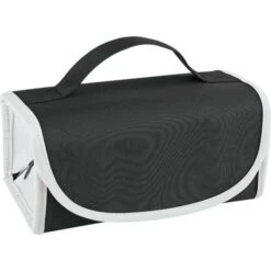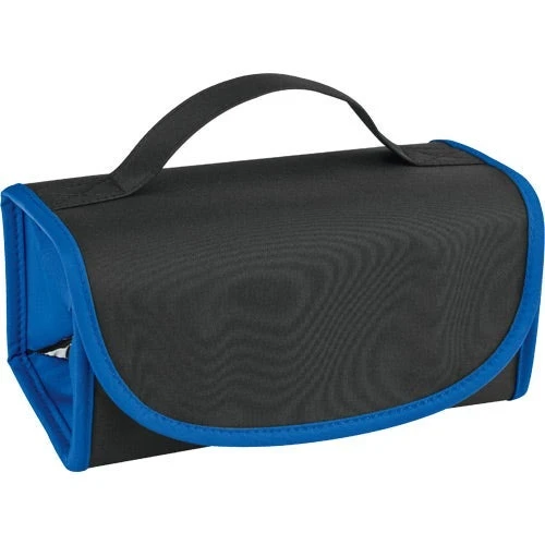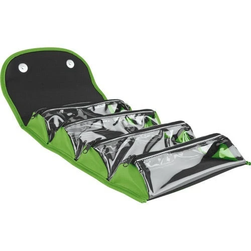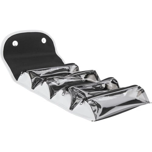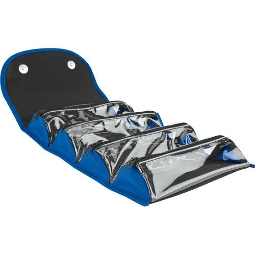 When these custom travel cases are opened your recipient is greeted with four individual clear zipper compartments that are perfectly sized for all their overnight items. When they’re packed and ready to go, these promotional cases fold up and snap closed with magnets to easily fit into suitcases or weekend bags. Your customers are going to love having this travel companion with them!