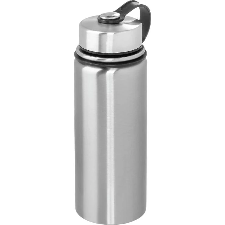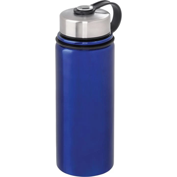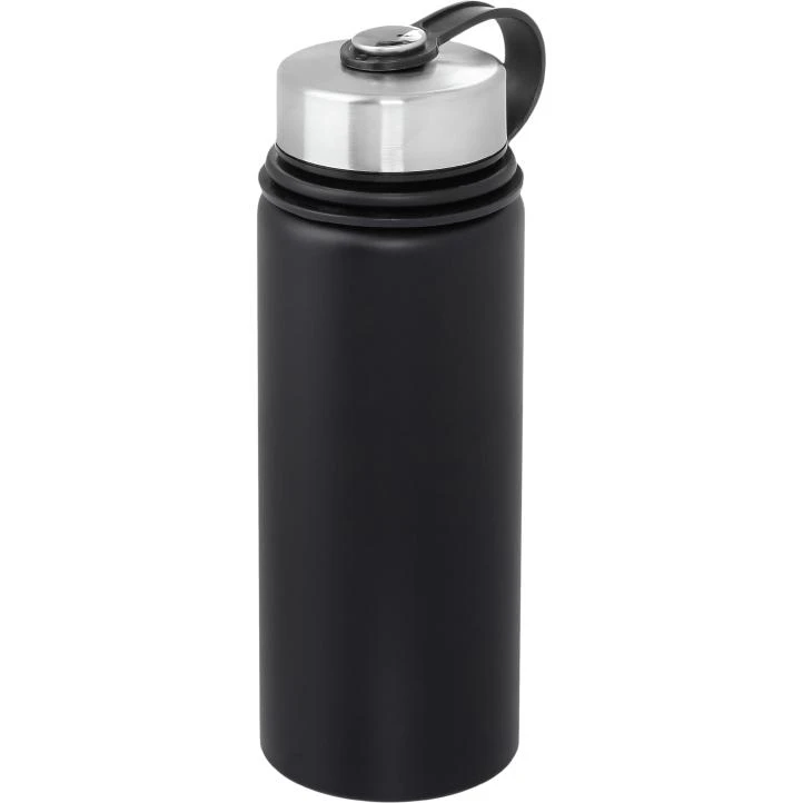 20 oz. double walled vacuum insulated stainless steel water bottle that will keep drinks cold up to 24 hours or hot up to 12 hours. Powder coated finish with attached screw-on leak resistant lid and loop handle. BPA free.