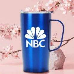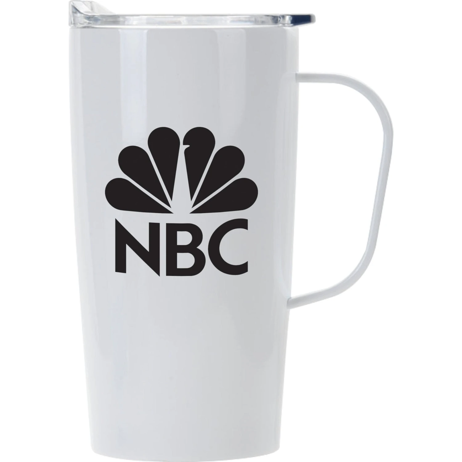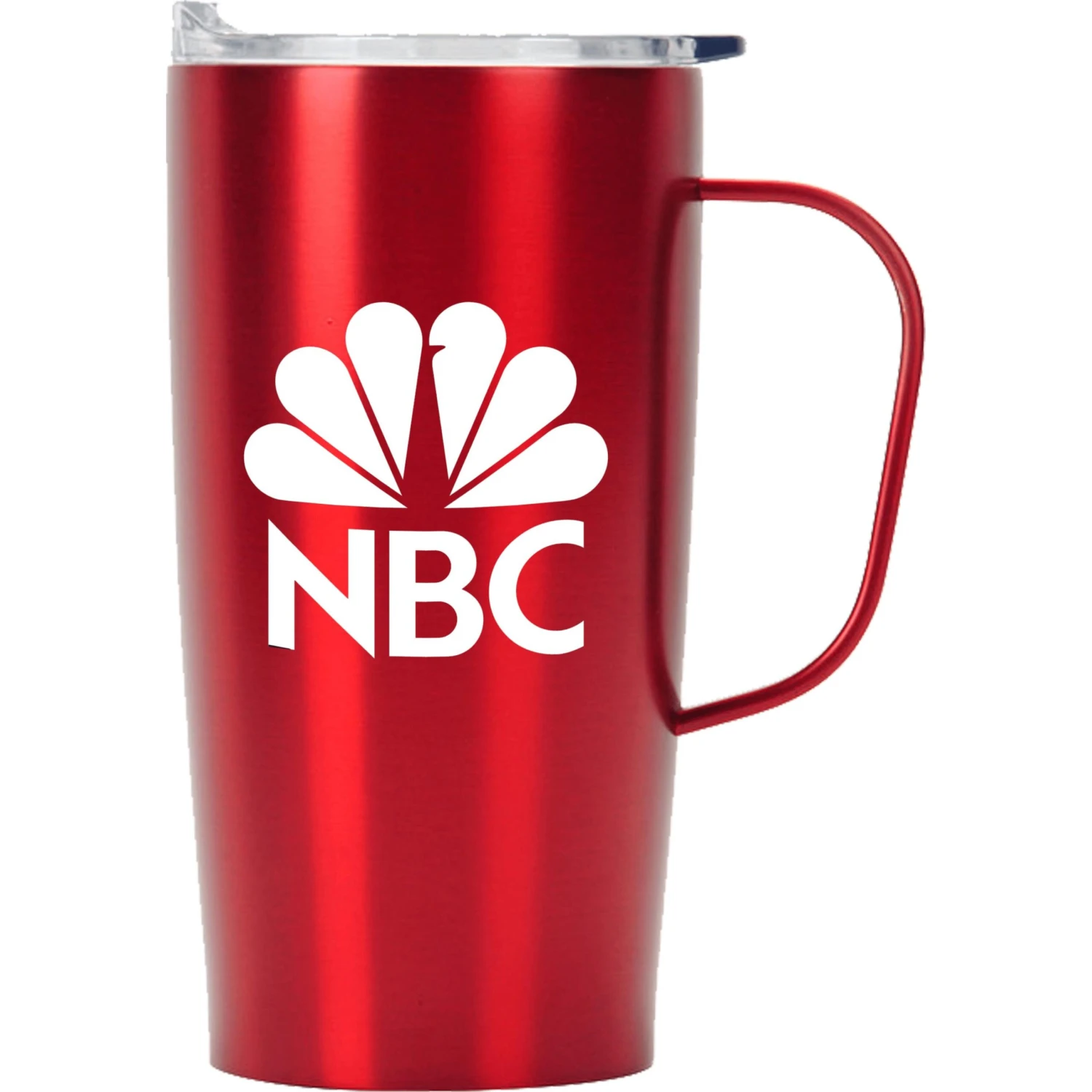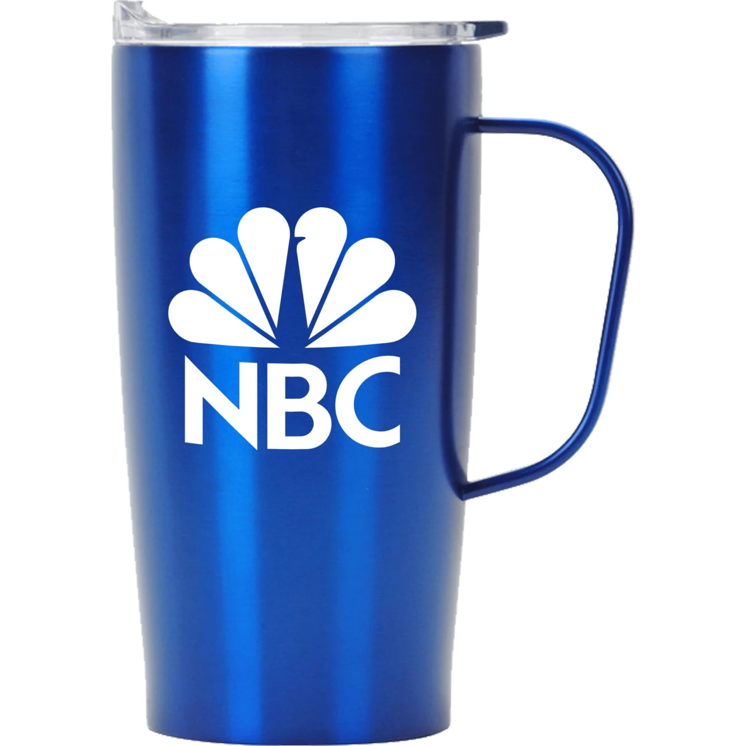 Grab hold of this sleek, straight-side 20 oz. stainless steel travel mug with a metal handle. Double-wall insulation keeps drinks hot or cold and a spill-resistant slide action lid with a rubber gasket to prevent mishaps. Meets FDA requirements, BPA free. Hand Wash Recommended.