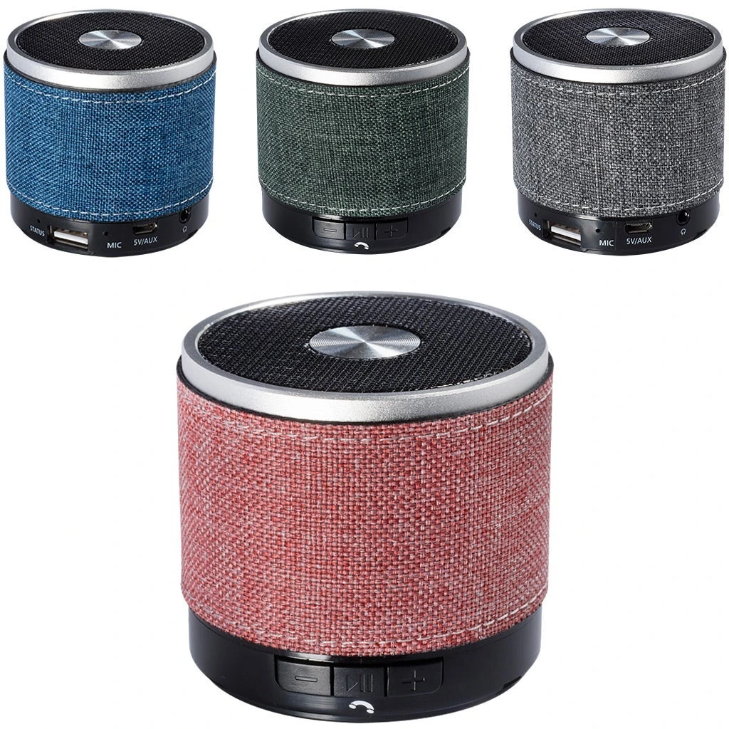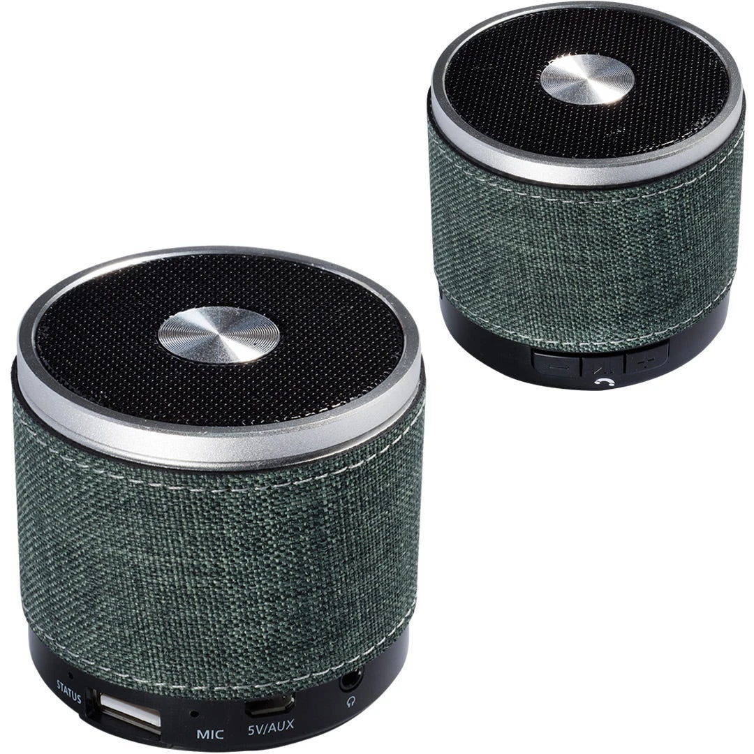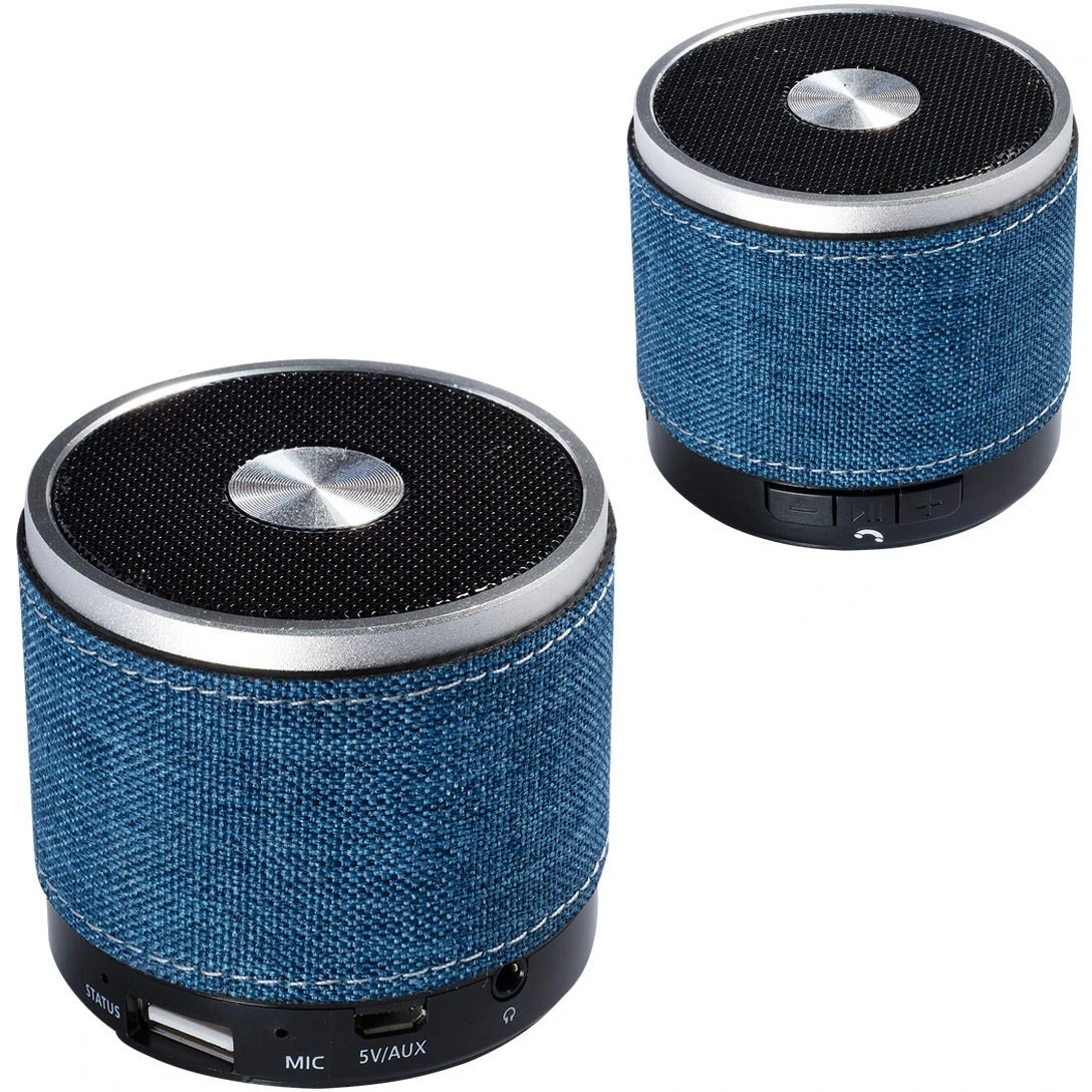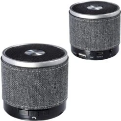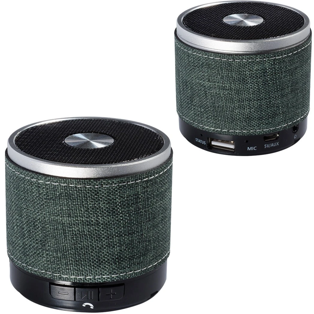 Palm sized cylinder Bluetooth speaker with snow canvas accent wrap body and no slip bottom. Power/Technology: Rechargeable lithium polymer battery: 3.7V; capacity: 350 mAh; input: DC 5V; output/power: 3W; aux in: 3.5mm audio jack; rated impedance: 4 Ohm; speaker: 1.6 inches; frequency response: 90-20KHz; SNR: = 85d; sensitivity: 80db +/- 2db; distortion: = 0.3%; transmission range: 10M (30 feet); Bluetooth 4.0. Pair with your smartphone to use hands-free microphone feature. Push button to answer calls. May also be powered with 3.5mm jack and audio cable (cable not included). Connects to your mobile device using wireless Bluetooth technology or through the 3.5mm audio cable (not provided). Also play MP3 files though a USB flash drive or TF card. Instructions included. CE and FCC approved.