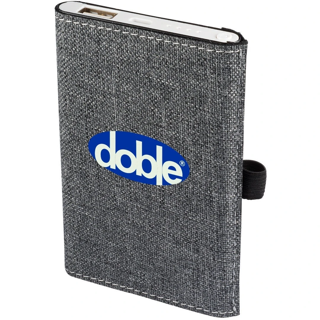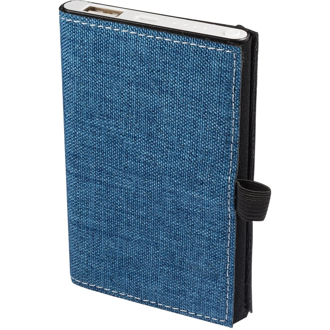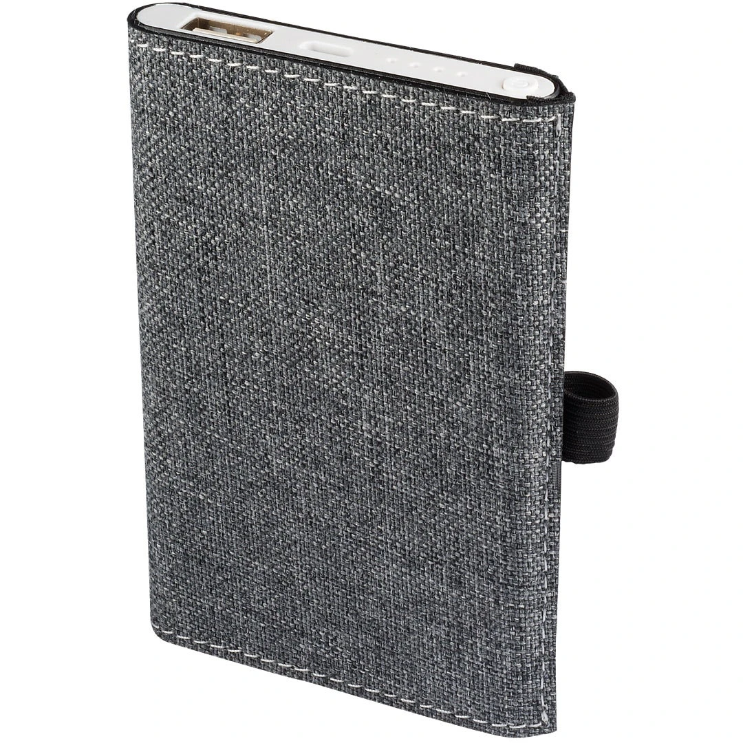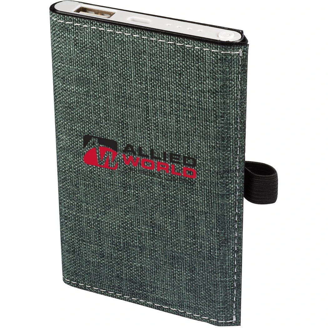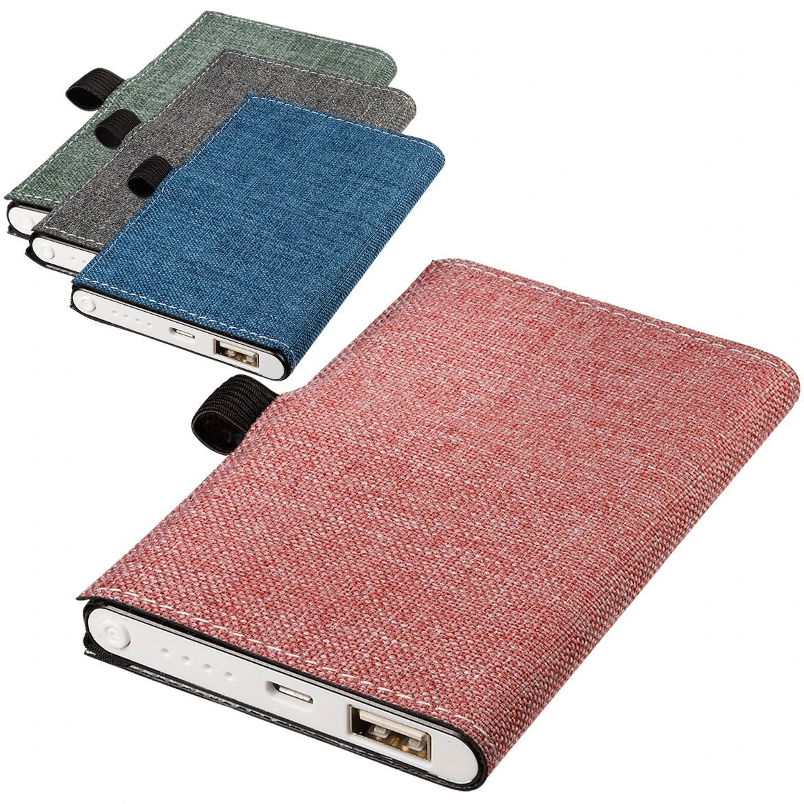 Slim aluminum power bank emergency battery charger with snow canvas accent wrap body. Power/Technology: input DC 5V/1000mA; output DC 5V/2100 mA. Rechargeable polymer battery. Capacity: 4000mAh. Features LED indicator light. Charge time differs by device. Must charge power bank prior to first use. Includes USB charging cable. UL certified.