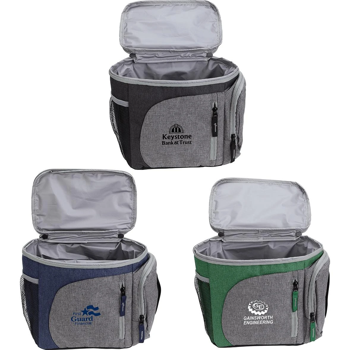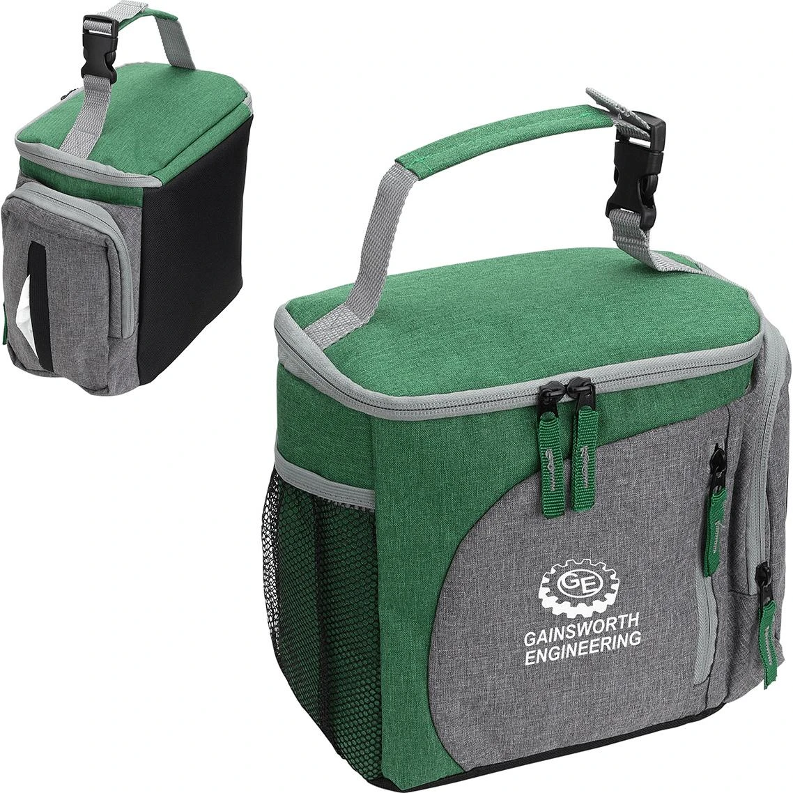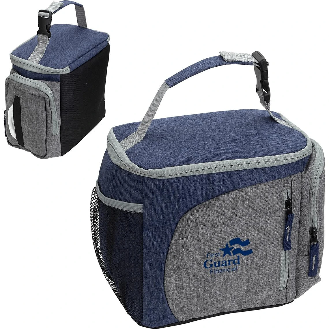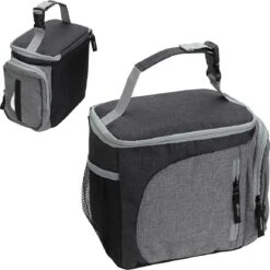 Made of 600D two toned polyester. Insulated with PE foam and lined with waterproof PEVA. Double zippered closing on top and web handle, in two tones, that separates to attach to a backpack or book bag. Side has net pocket, with elastic opening, for water bottle. Front has zippered pocket for accessories. Side pocket has easy-load zippered opening for loading napkins and an over-lapped opening for access to napkins. All zippers have ribbon extensions, in contrast color, for easy access and to compliment the two-toned design of cooler bag.
