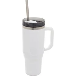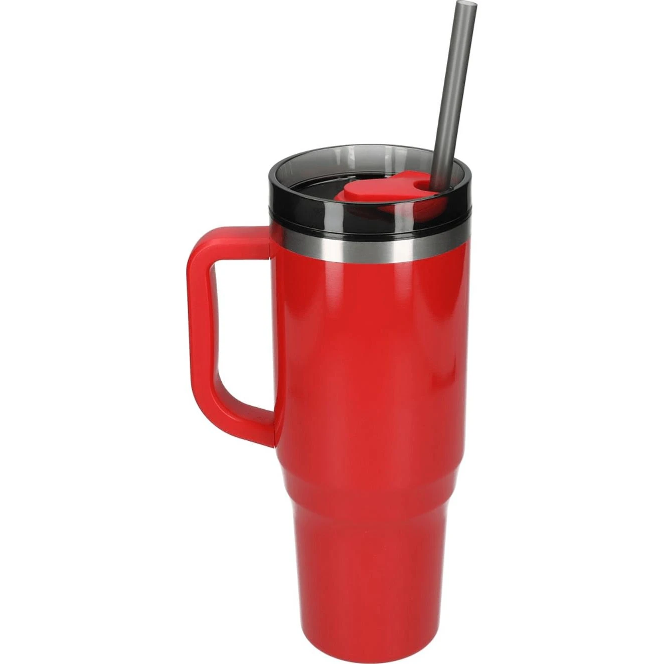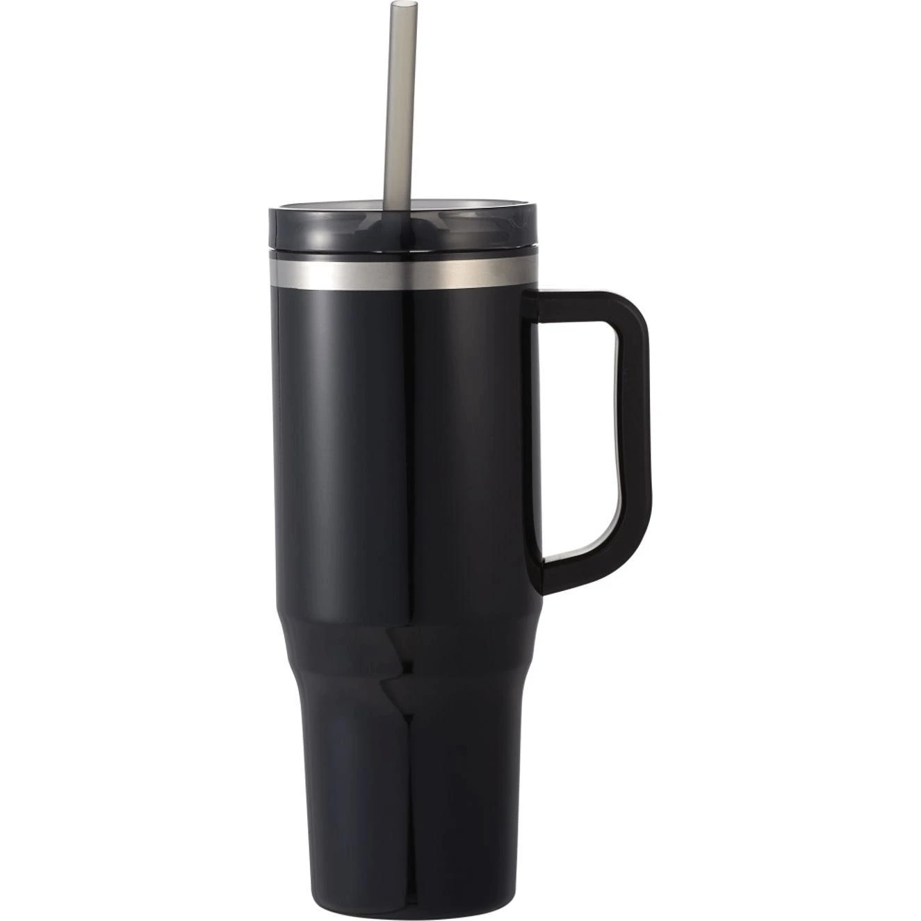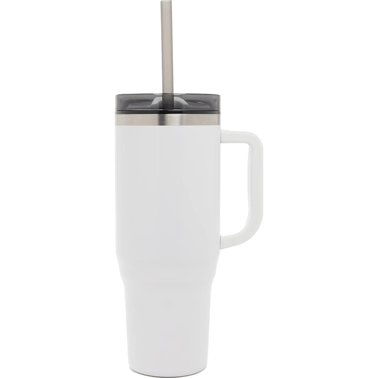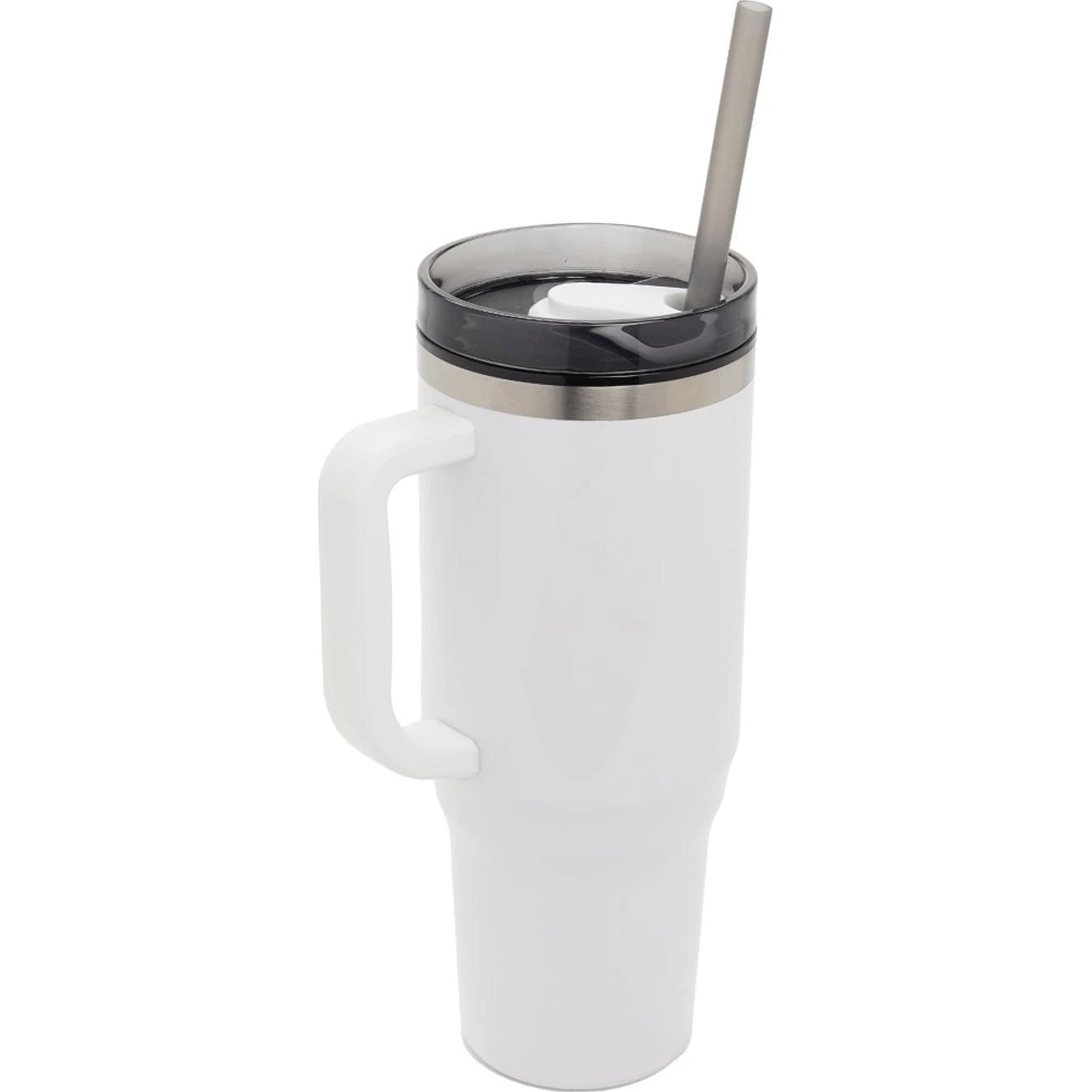 The 40 oz. Thor Eco Friendly Straw Tumbler features durable double-wall construction to keep your beverages hot or cold in any environment. Food-grade recycled straw included for easy reuse daily. The Thor has a 40 oz. capacity for fewer refills and features a slim base that fits into most cupholders, comfortable carry handle, and splash-proof press-on lid with two openings and a swivel closure, friendly to both sippers and chuggers! Hand-wash only.