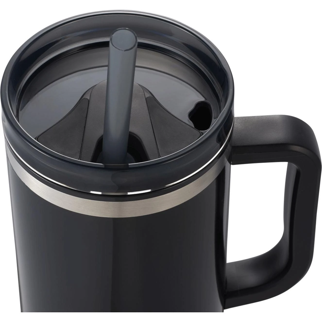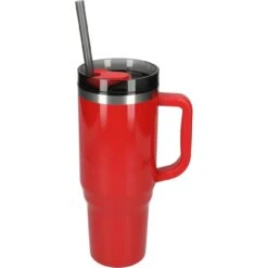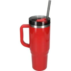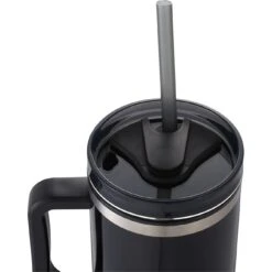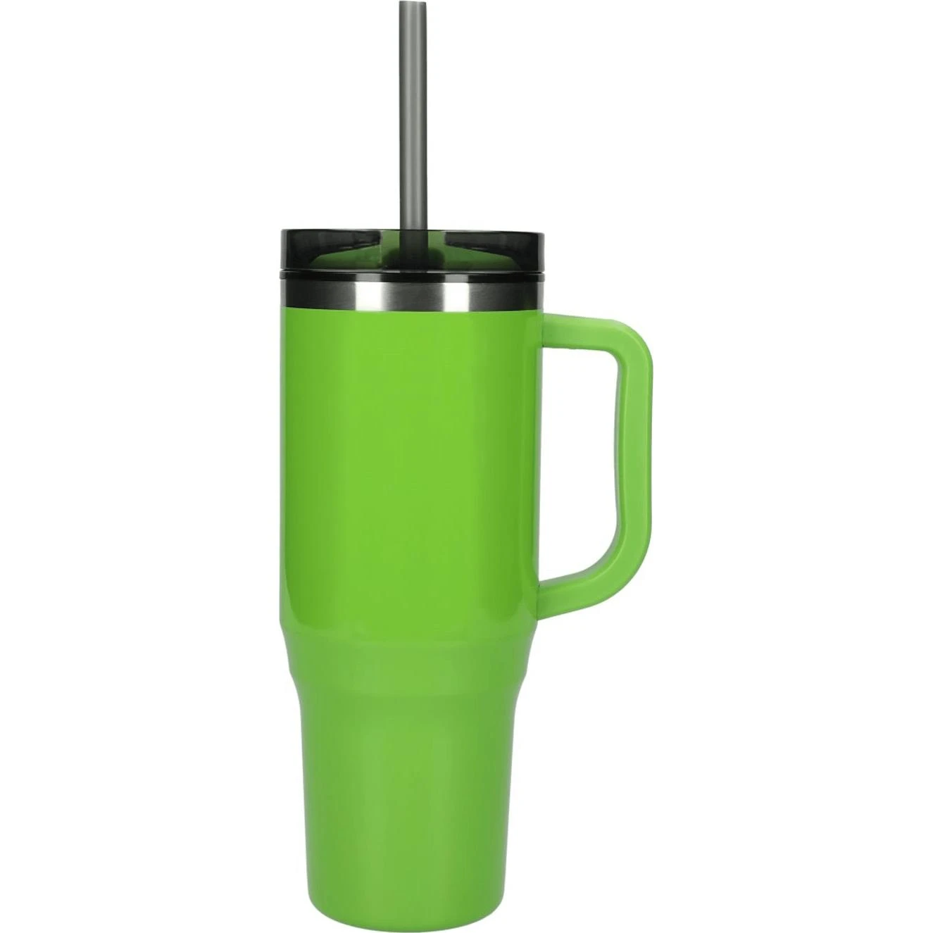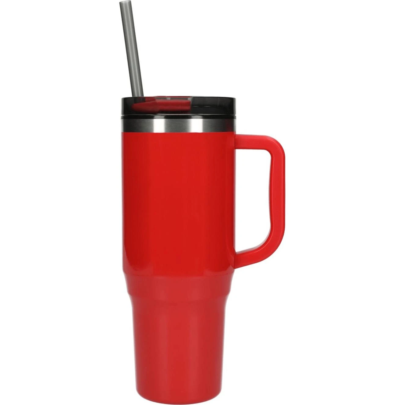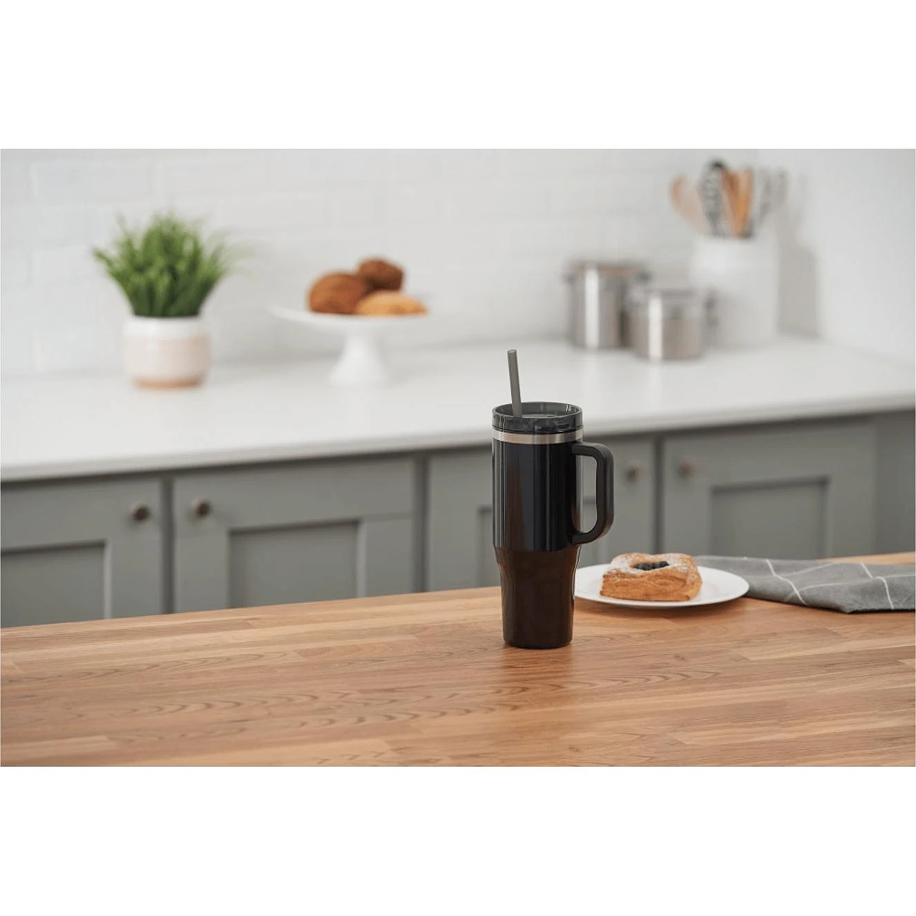 The 40 oz. Thor Eco Friendly Straw Tumbler features durable double-wall construction to keep your beverages hot or cold in any environment. Food-grade recycled straw included for easy reuse daily. The Thor has a 40 oz. capacity for fewer refills and features a slim base that fits into most cupholders, comfortable carry handle, and splash-proof press-on lid with two openings and a swivel closure, friendly to both sippers and chuggers! Hand-wash only.