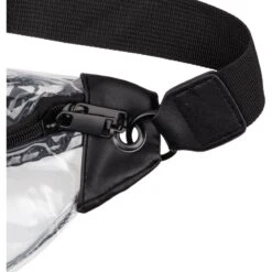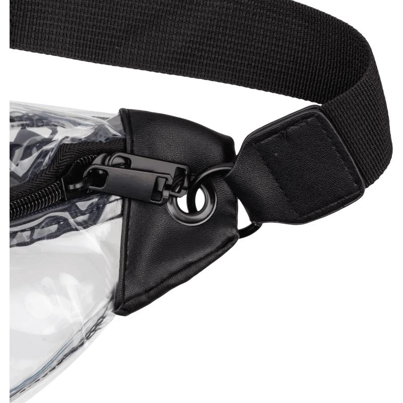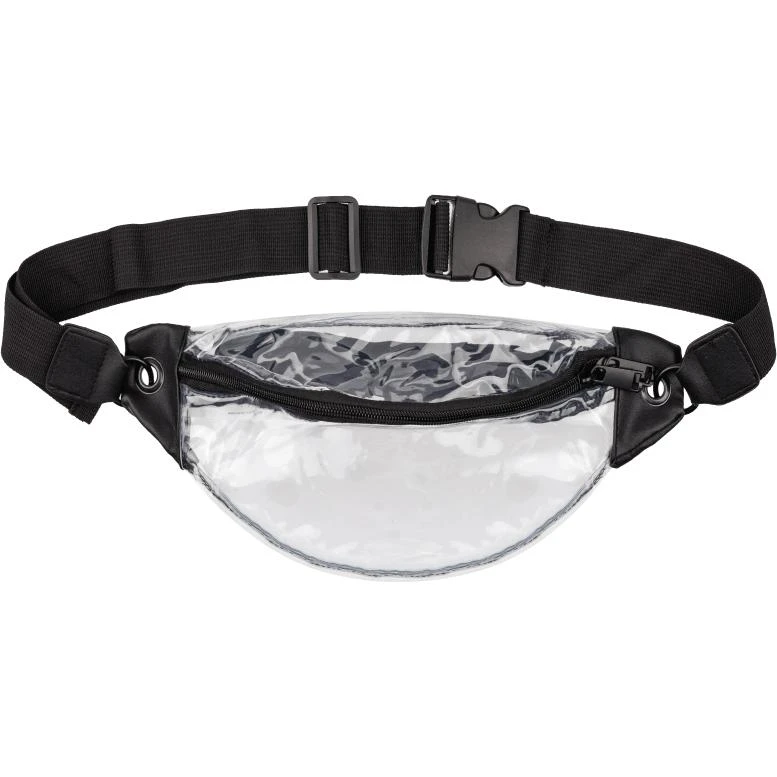 Transparent PVC fanny pack perfect to see your contents inside with some privacy. Features main zippered compartment and a hidden backside compartment, adjustable poly-web waist strap with plastic buckle, and leatherette trim pieces. Adjustable strap fits up to 37″.