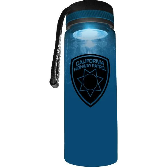 Transparent bottle made of durable Tritan plastic. COB flashlight screw on lid with carrying strap. Carrying strap has screw-on connector. Two different flashlight modes outward from top of lid and inward shining into bottle. Wide mouth opening. Charging port on lid to recharge. Flashlight charging cord included. Flashlight will last 6-8 hours before needing to be recharged. Charging cable and instruction sheet packed inside bottle. Top shelf dishwasher safe.