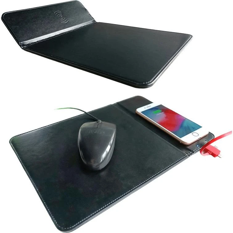 Mouse pad made of Thermo PU featuring wireless charging panel with adjustable stand. Power and technology: Input: 5V/2A; Output: 5V/1A, Wireless Output 5W; Charging efficiency: greater than 76%; Wireless charging distance: less than 0.23″ (6mm). Wireless charging mat feature is designed to charge most remote wireless charging enabled smartphones (including iPhones 11, 12, 13, 13 Pro) and operates at lower temperature than most traditional chargers. Check your device specs for compatibility prior to purchase. Includes Instructions and charging cable. FCC approved.