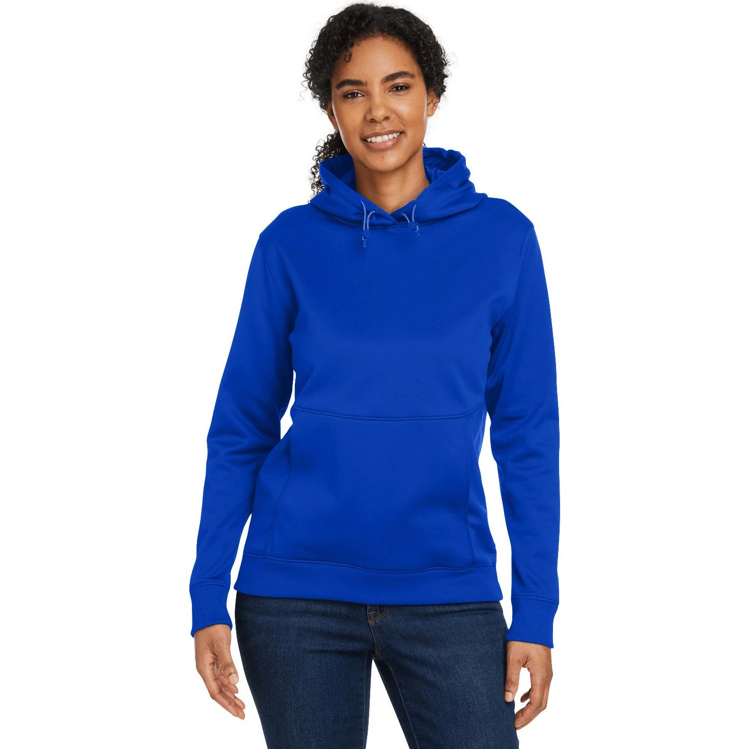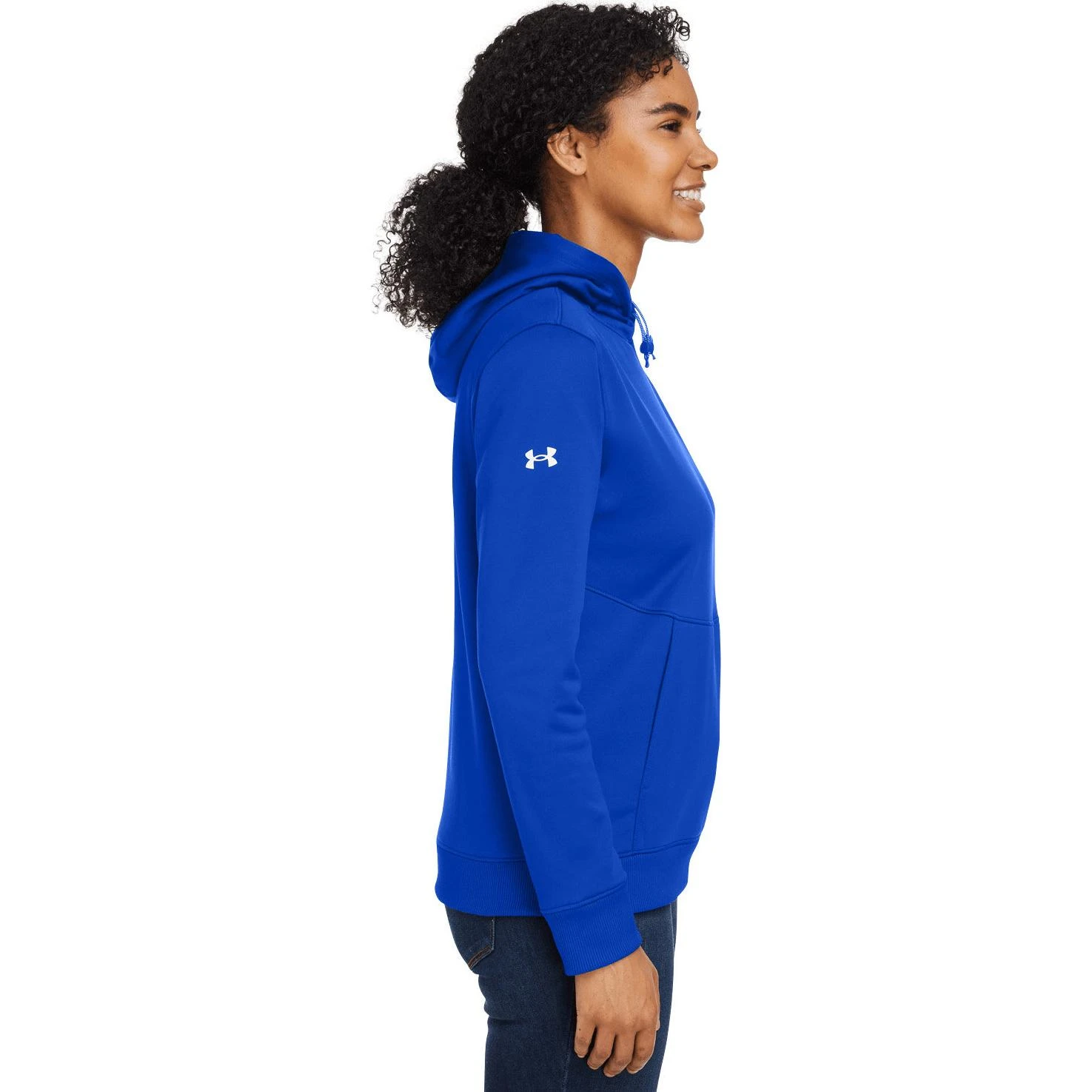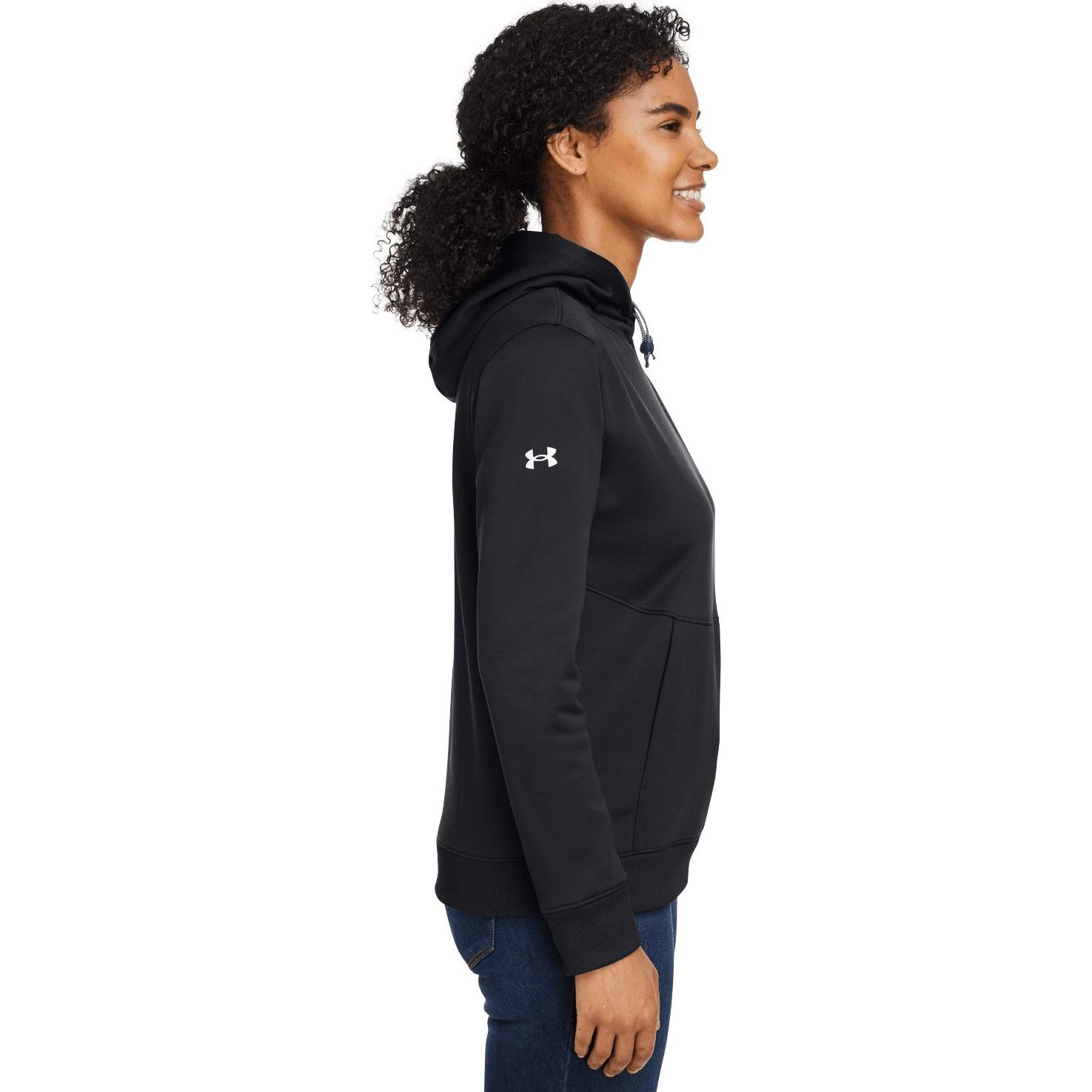 100% polyester. UA Storm technology repels water without sacrificing breathability. Armour Fleece is light, breathable and stretchy for warmth that still lets you move. Soft inner layer traps heat to keep you warm and comfortable. Bungee adjust hood. Front pouch pocket. Ribbed cuffs and bottom hem. Loose, fuller cut for complete comfort.
