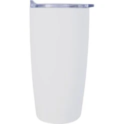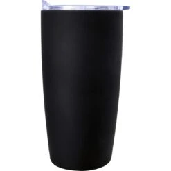 Stainless steel outer and inner. Smooth rubberized finish. Double wall construction for insulation of hot or cold liquids. Snap-on, spill-resistant thumb-slide lid with rubber gasket. Due to vacuum insulation technology, capacity is 18 oz. with lid on. Keeps drinks hot or cold up to 6 hours. Non-slip bottom. Lids shipped separately. Meets FDA requirements. BPA free. Hand wash recommended.