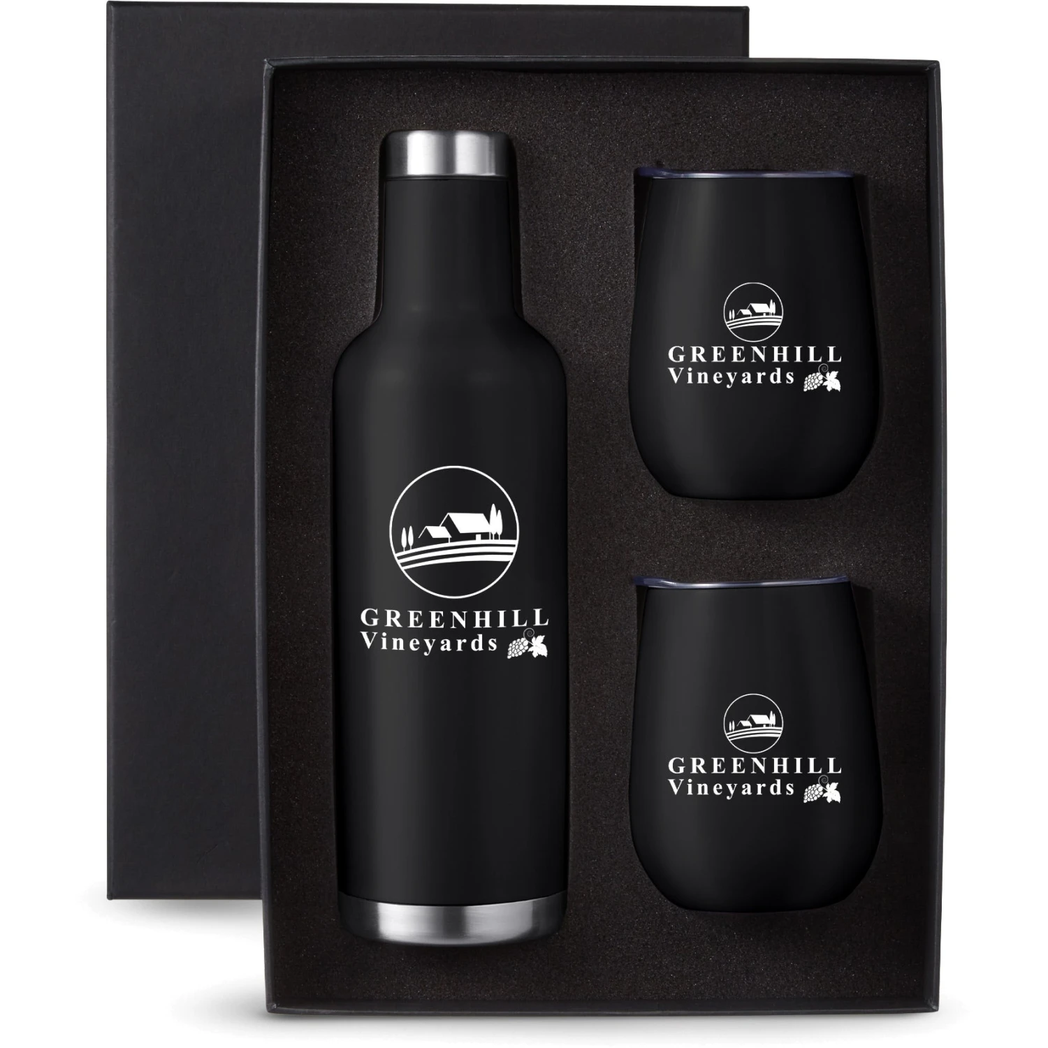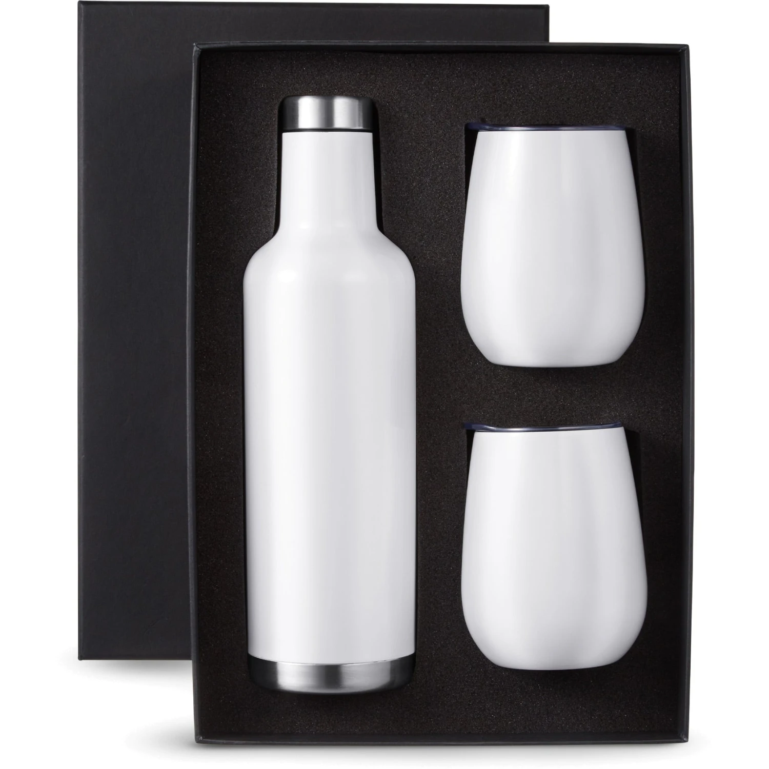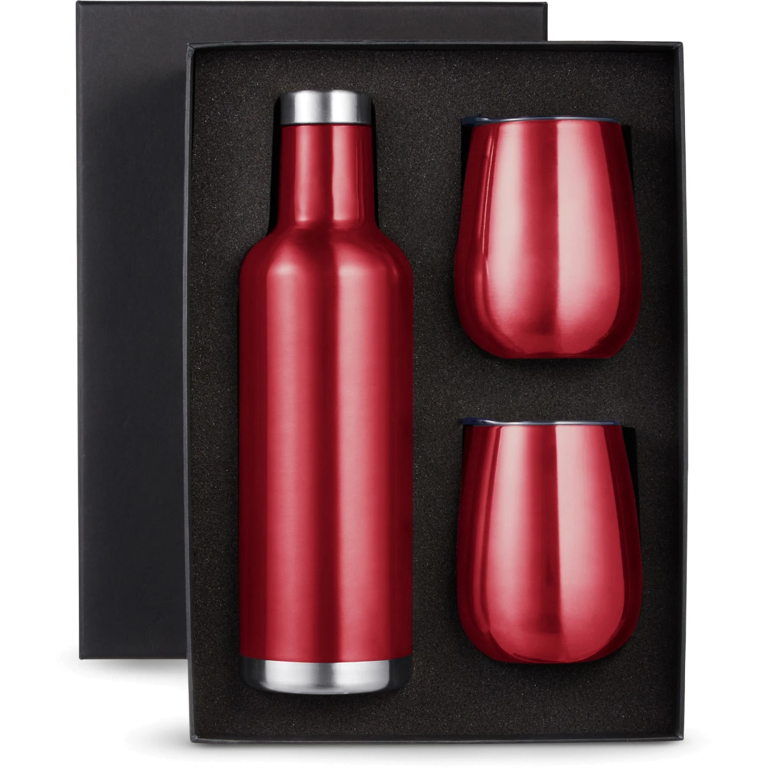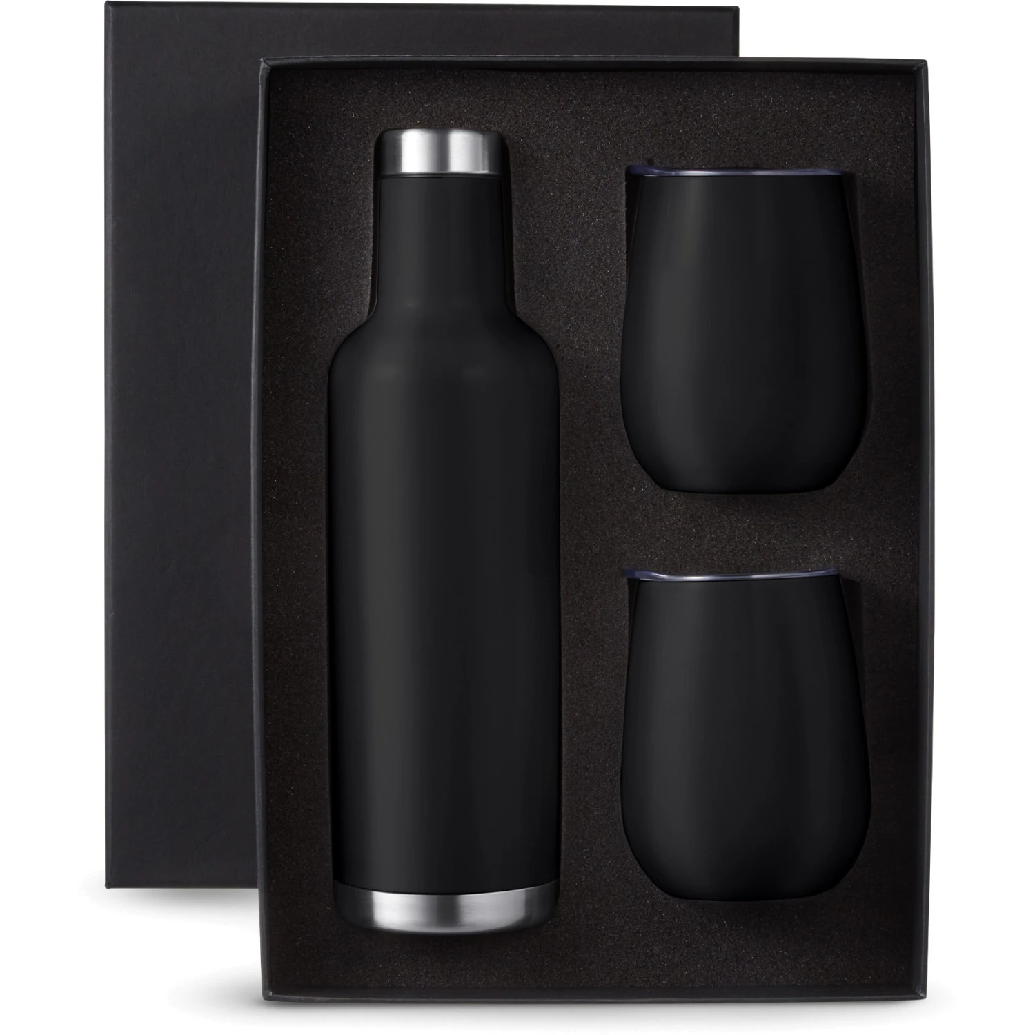 Gift set includes one 25 oz. Alsace vacuum insulated wine bottle and two matching color 10 oz. stemless vacuum wine tumblers with lid, both in an elegant black gift box.