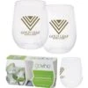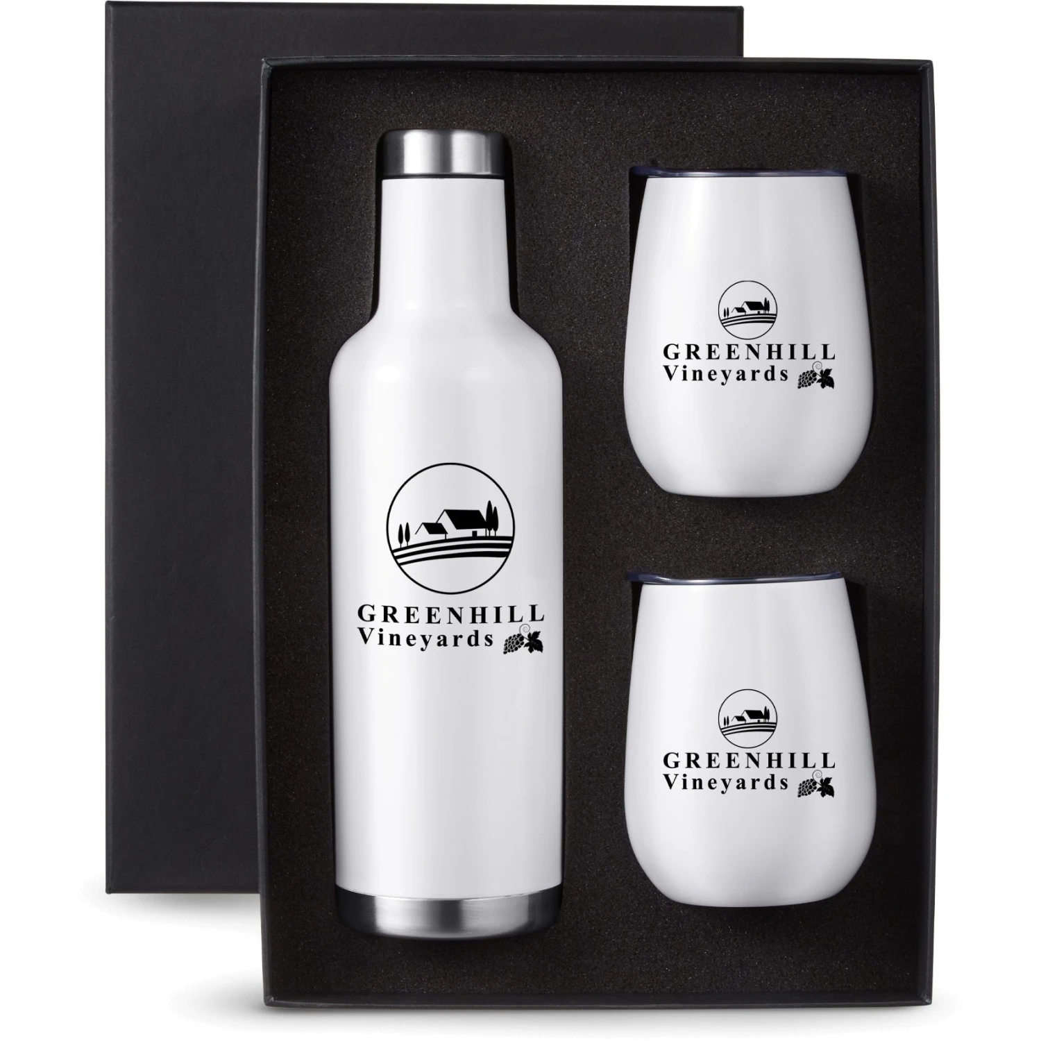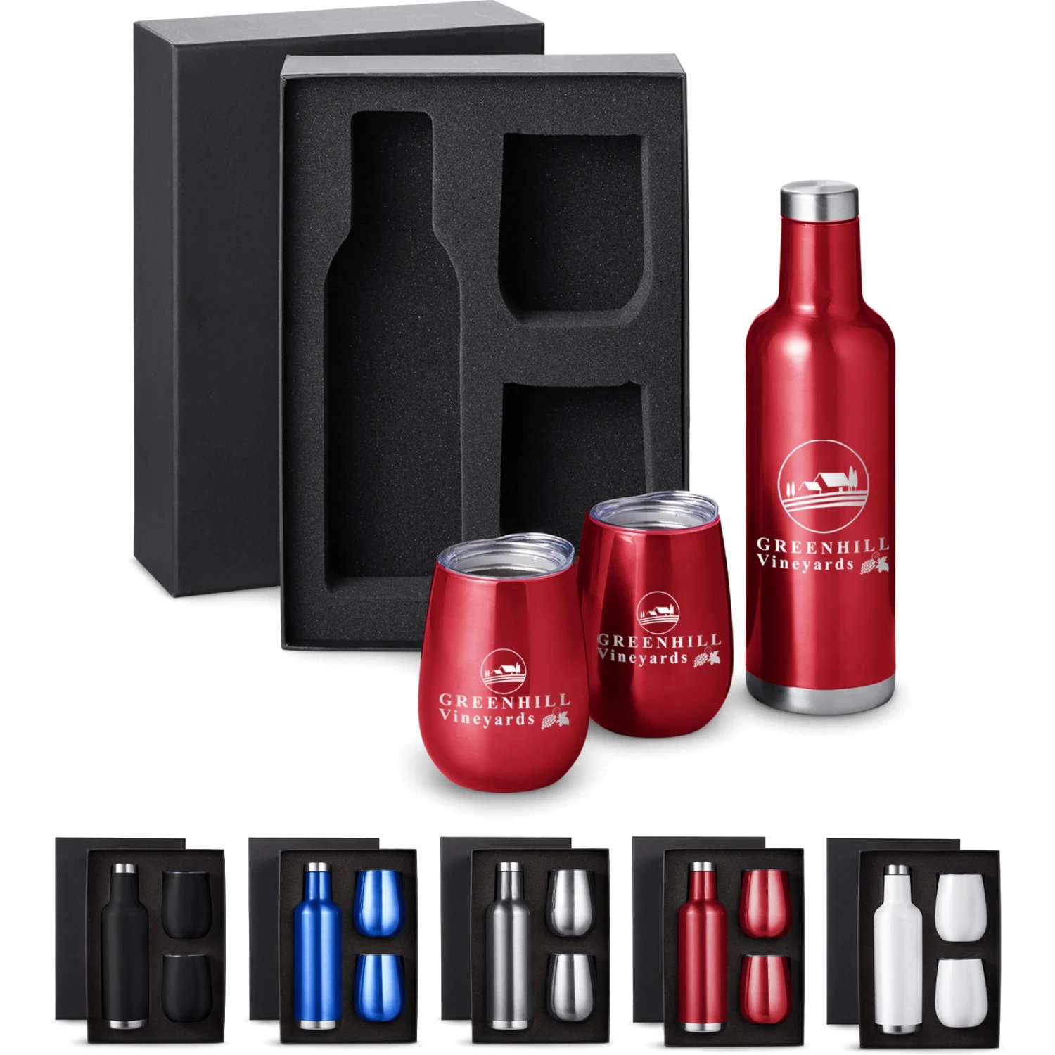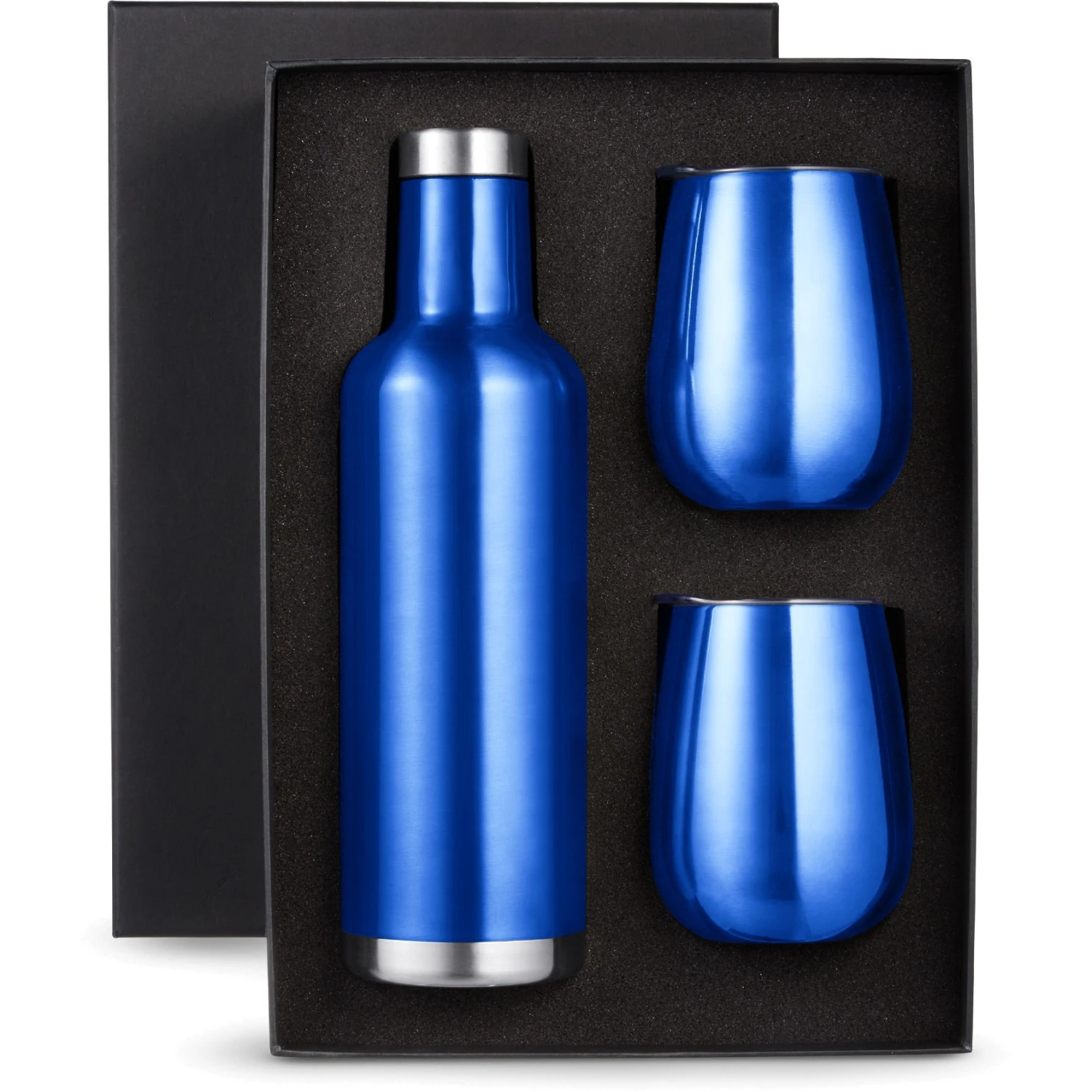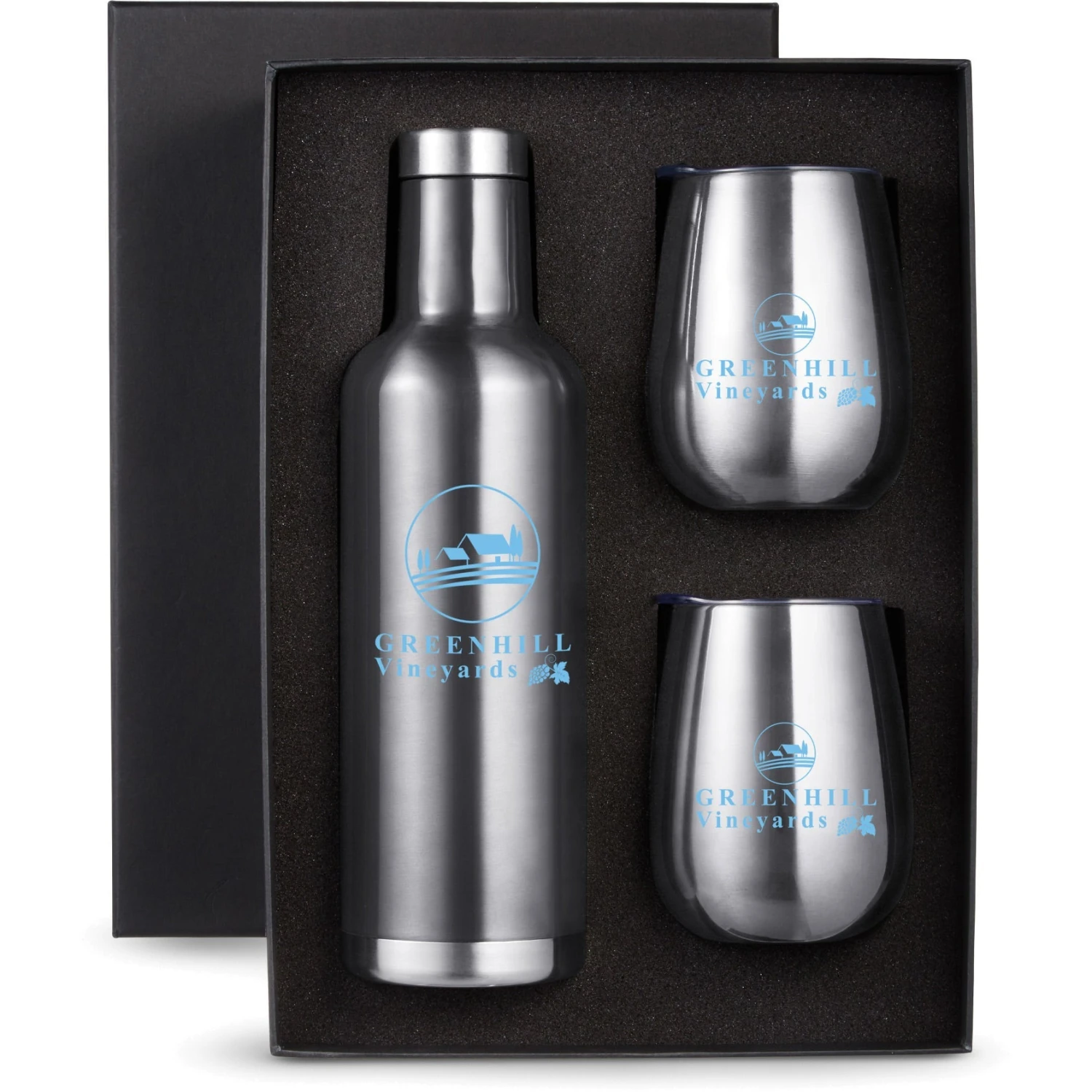 Gift set includes one 25 oz. Alsace vacuum insulated wine bottle and two matching color 10 oz. stemless vacuum wine tumblers with lid, both in an elegant black gift box.