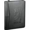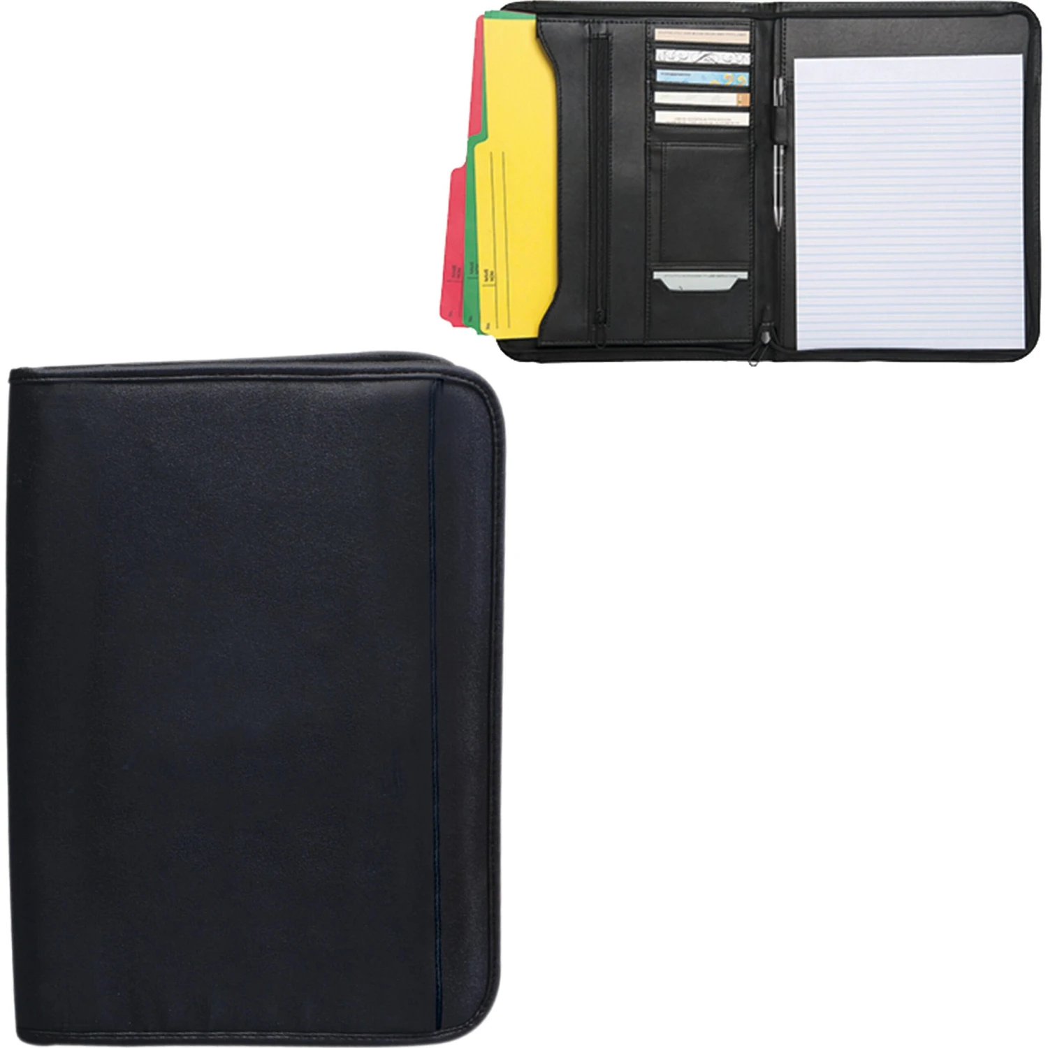 Simulated leather. Three-sided zipper closure. Inside business card and other various pockets. Accordion inside pocket with an additional zippered inside pocket. Paper pad and black Sonota Glass pen with blue ink included.